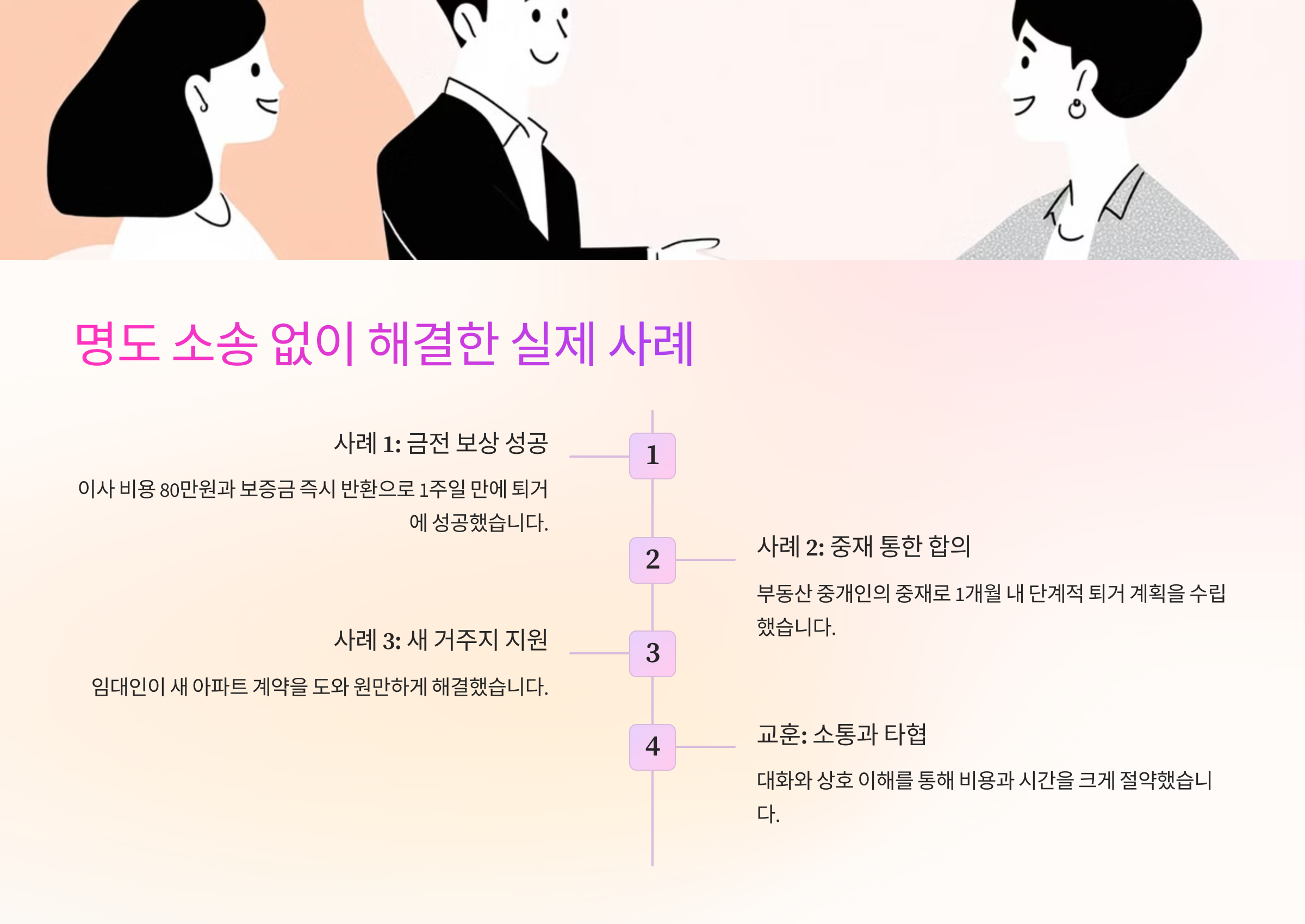 퇴거 합의를 잘 진행하면 소송 없이 최소 비용으로 신속하게 해결할 수 있어요! 😊