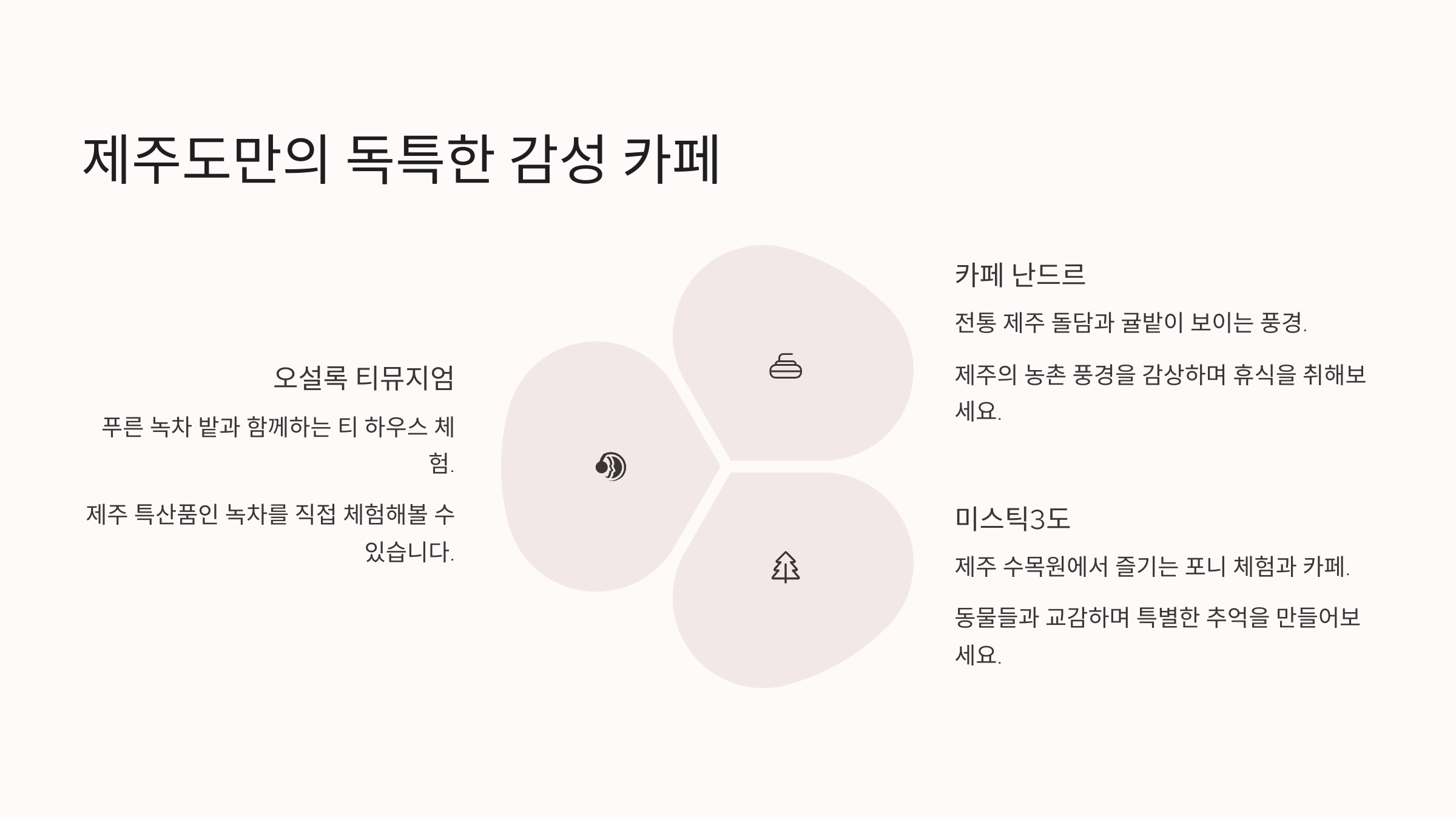 제주도는 감성 카페의 천국이라고 해도 과언이 아니에요! 🌴 특히 제주에서만 경험할 수 있는 특별한 콘셉트의 카페들이 많아 여행의 즐거움을 더해 준답니다. 색다른 분위기를 느낄 수 있는 감성 카페들을 소개할게요.