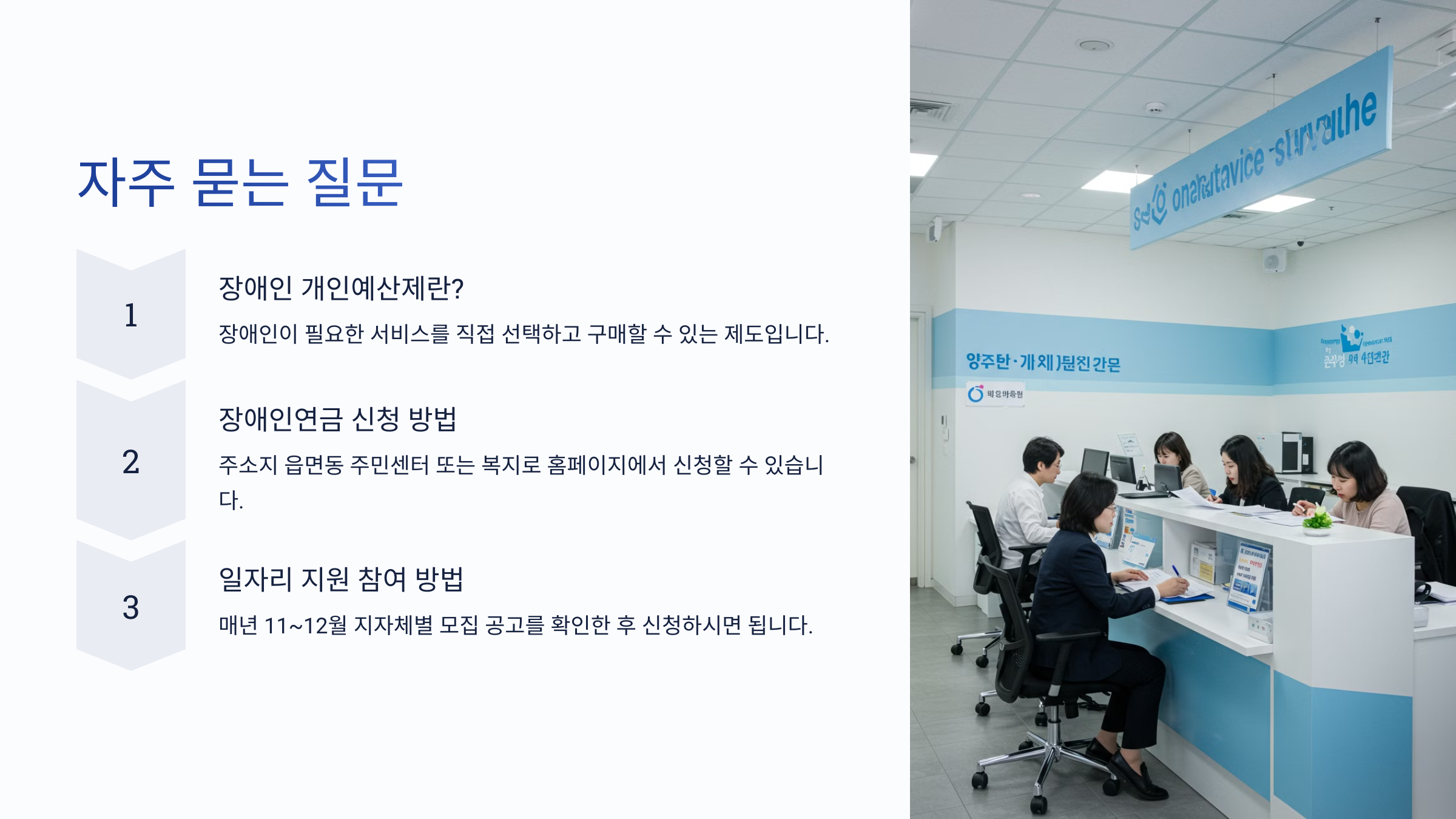 A8. 지역별 장애인 복지센터에서 신청 가능하며, 지자체마다 운영 방식이 달라요.