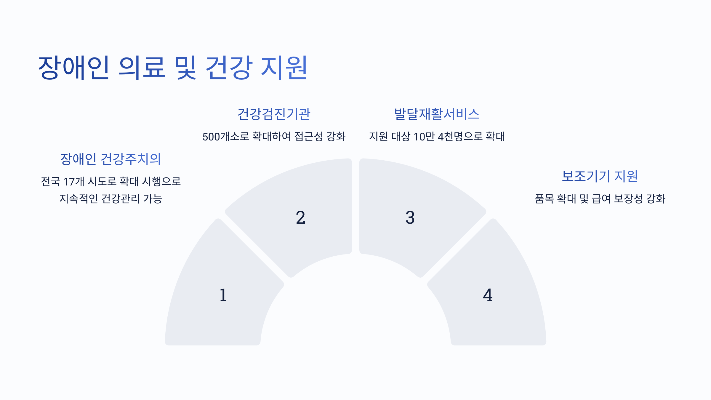 | 보조기기 지원 확대 | 전동휠체어, 보청기, 의족 지원 확대 |