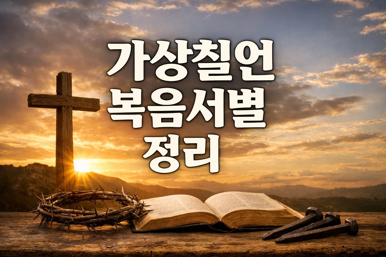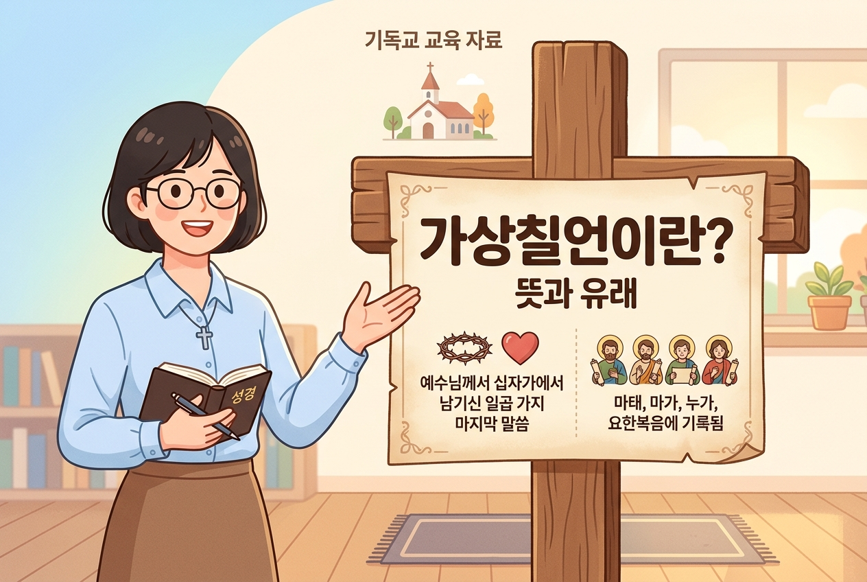 예수님이 십자가 위에서 남기신 마지막 일곱 말씀, 가상칠언은 고난주간마다 많은 분들이 묵상하는 핵심 말씀이에요. 그런데 이 일곱 말씀이 어느 복음서에 기록되어 있는지, 각 복음서마다 왜 다른 말씀을 담았는지 정확히 아시는 분은 많지 않습니다. 이 글에서는 가상칠언의 뜻부터 복음서별 비교표, 신학적 의미, 그리고 묵상 가이드까지 한 번에 정리해 드릴게요.