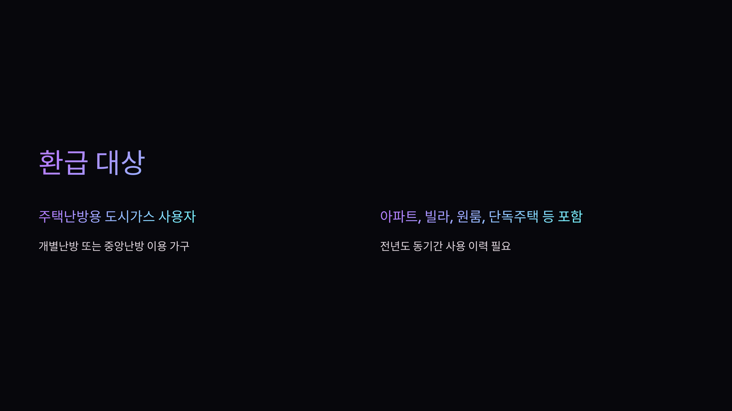 - 도시가스 사용 가구: LPG, 등유 사용 가구는 별도 지원