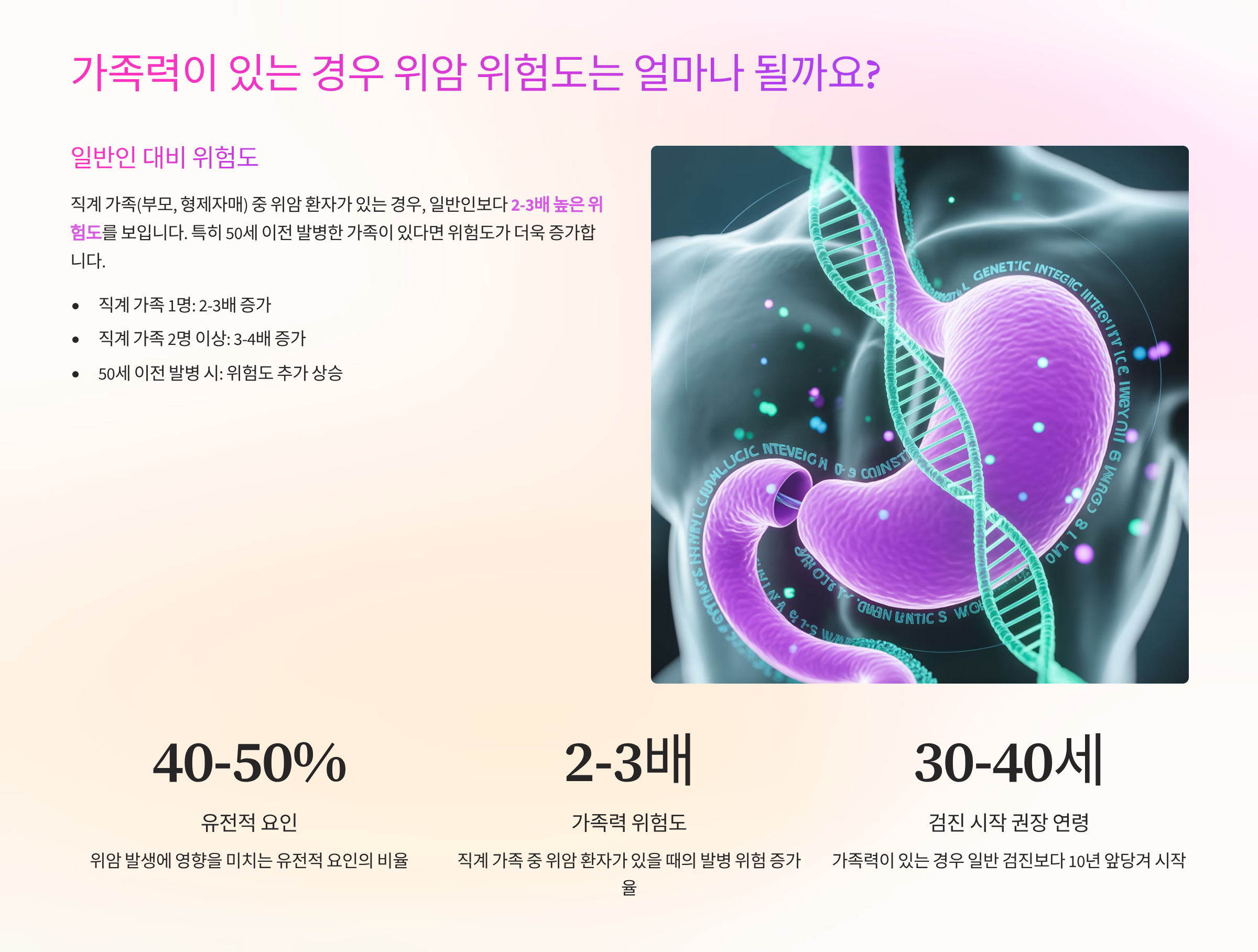 위암은 유전적 영향이 비교적 큰 암 중 하나예요. 특히 직계가족(부모, 형제, 자매 등) 중 위암을 진단받은 이력이 있는 경우, 본인도 위암 발병 위험이 일반인보다 높다고 알려져 있죠. 실제로 연구에 따르면 가족 중 위암 환자가 있는 경우 위암 발병 확률이 2~3배까지 높아질 수 있어요.
