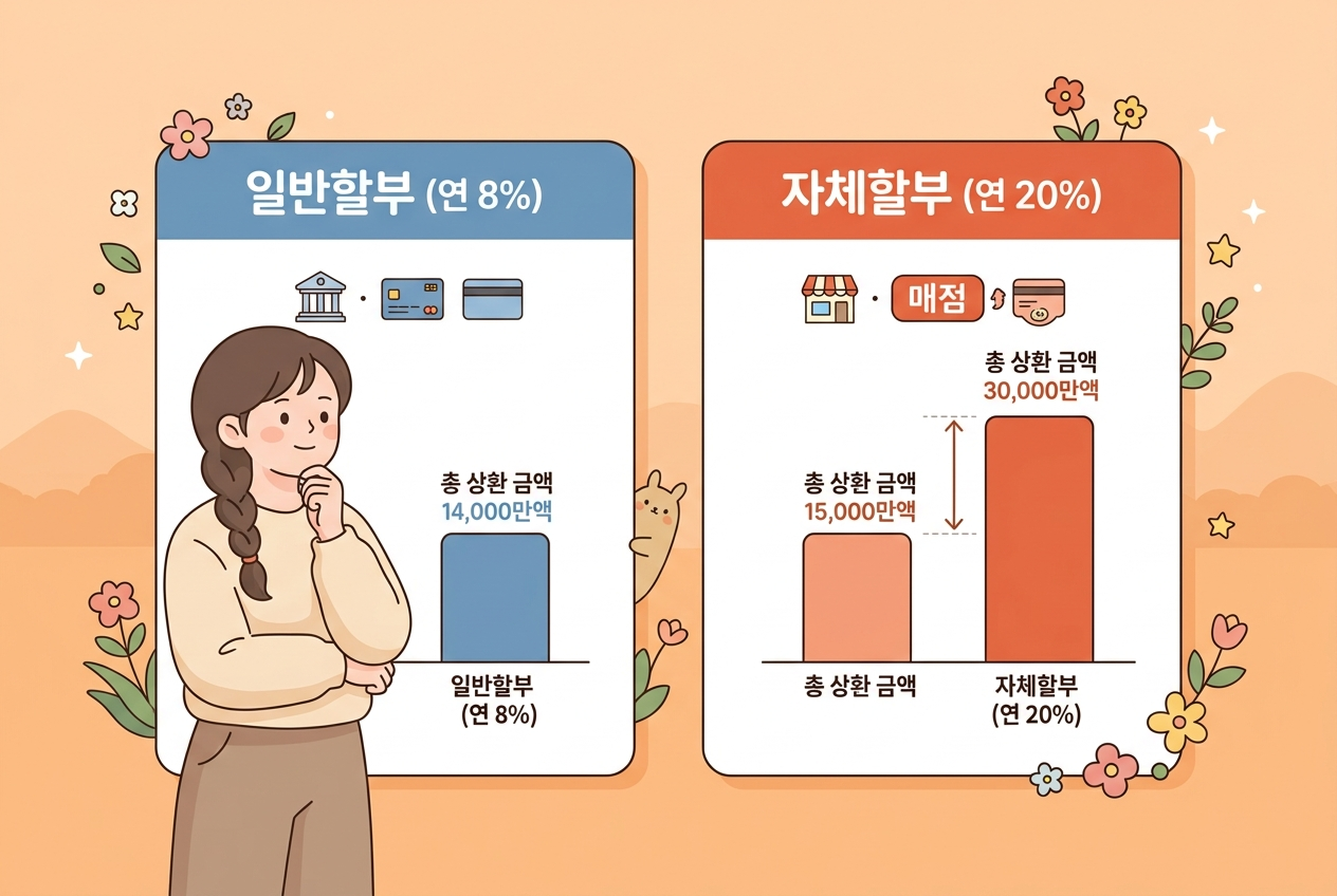 | 구분 | 일반 할부 (연 8%) | 자체할부 (연 20%) |