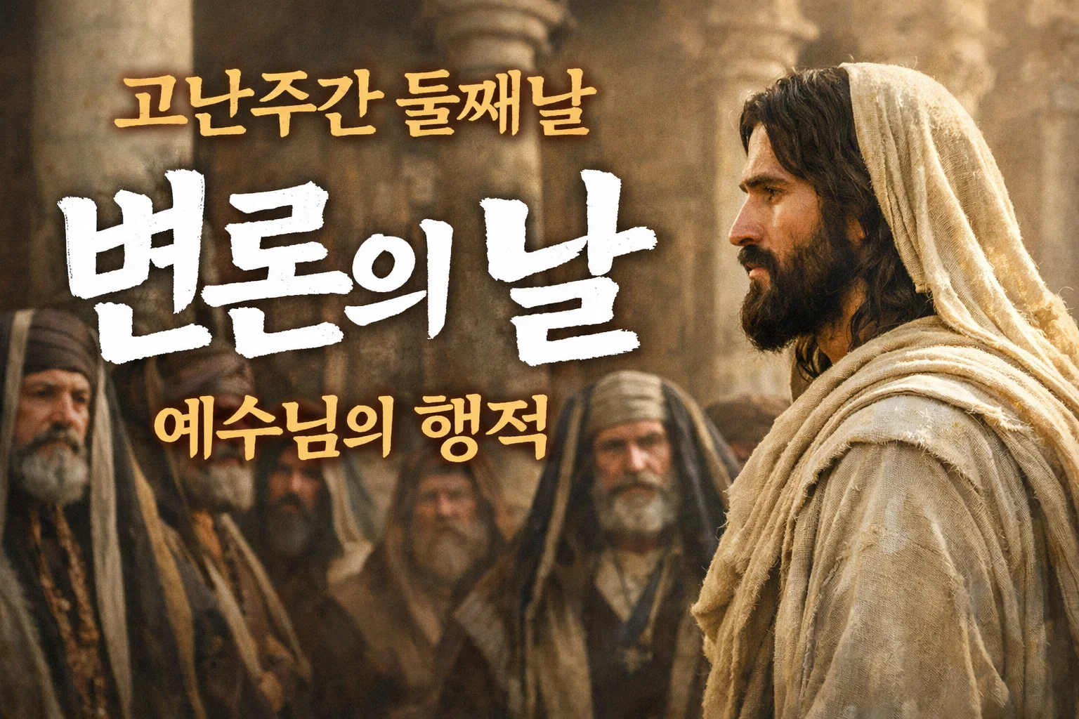 고난주간 변론의 날(화요일) 예수님은 성전에서 종교지도자들과 납세 논쟁, 부활 논쟁, 가장 큰 계명 논쟁을 펼치시며 완벽한 지혜로 응답하셨어요. 바리새인에 대한 7가지 화를 선포하시고, 감람산에서 종말 강화를 전하셨습니다.