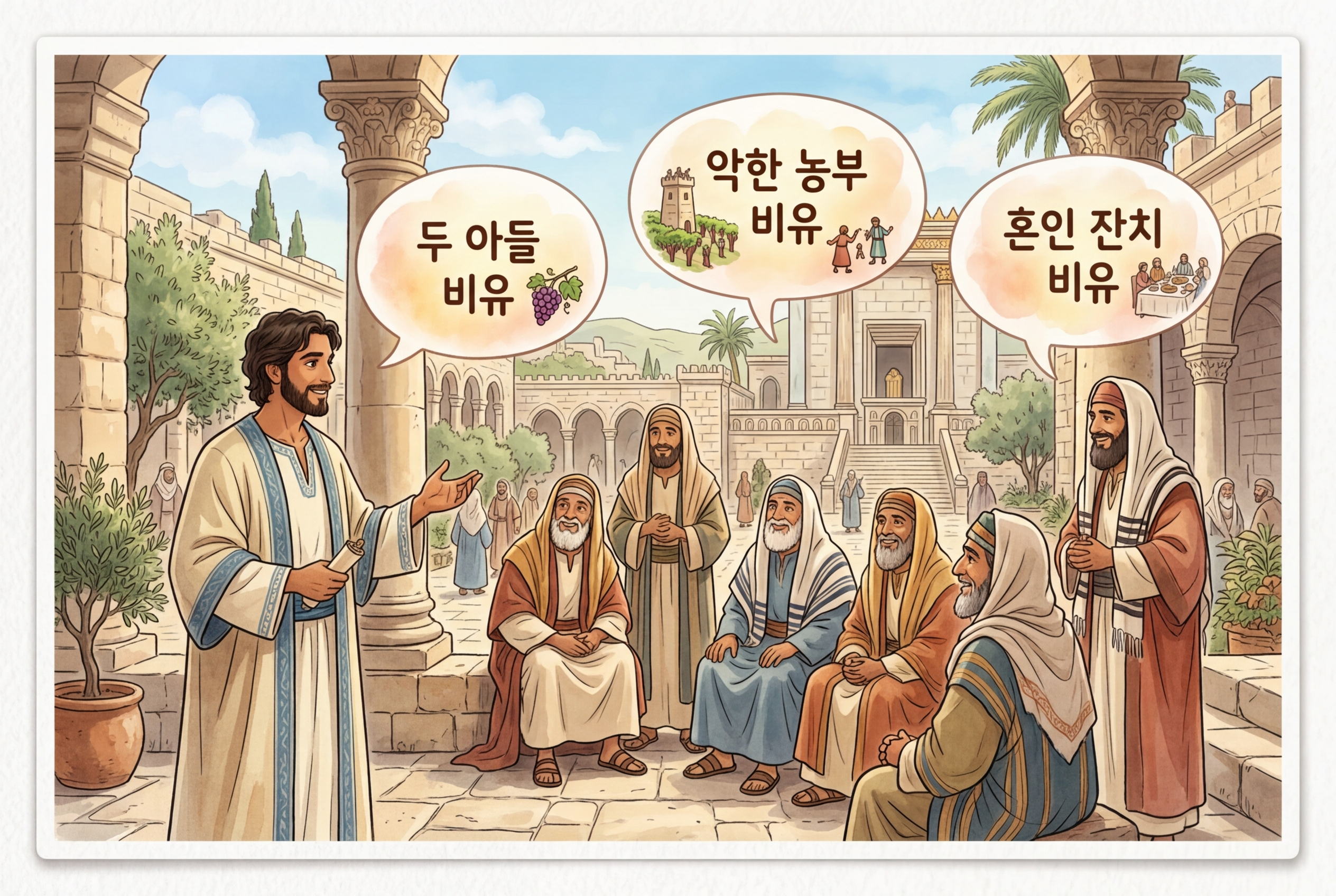 이어서 예수님은 세 가지 비유를 통해 종교지도자들을 직접 책망하셨어요. 두 아들의 비유(마 21:28-32), 악한 농부의 비유(마 21:33-46), 혼인 잔치의 비유(마 22:1-14)가 바로 그것입니다.