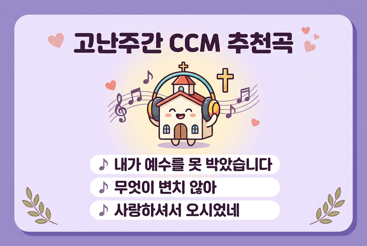 찬송가만으로는 아쉬운 분들을 위해 고난주간 CCM 추천곡도 정리했어요. '내가 예수를 못 박았습니다'(어노인팅)는 회개의 깊은 감동을 주는 곡으로, 성금요일 예배에서 특히 많이 불리는 곡이에요.