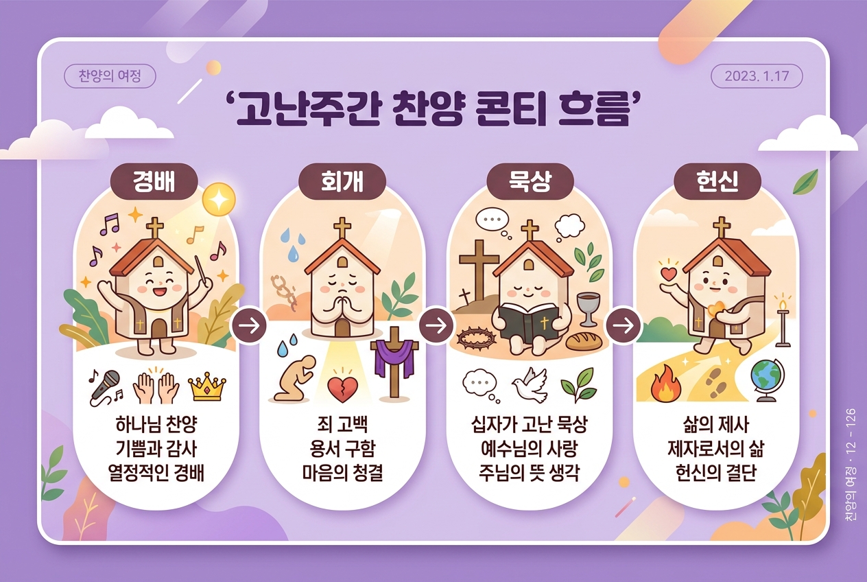 콘티는 '경배 → 회개 → 묵상 → 헌신'의 흐름을 지키고, 요일별 묵상 주제에 맞는 찬양을 배치하면 예배의 깊이가 확 달라질 거예요. 이번 고난주간, 찬양을 통해 십자가 앞에 한 발 더 가까이 나아가는 은혜로운 시간이 되시길 바랍니다.
