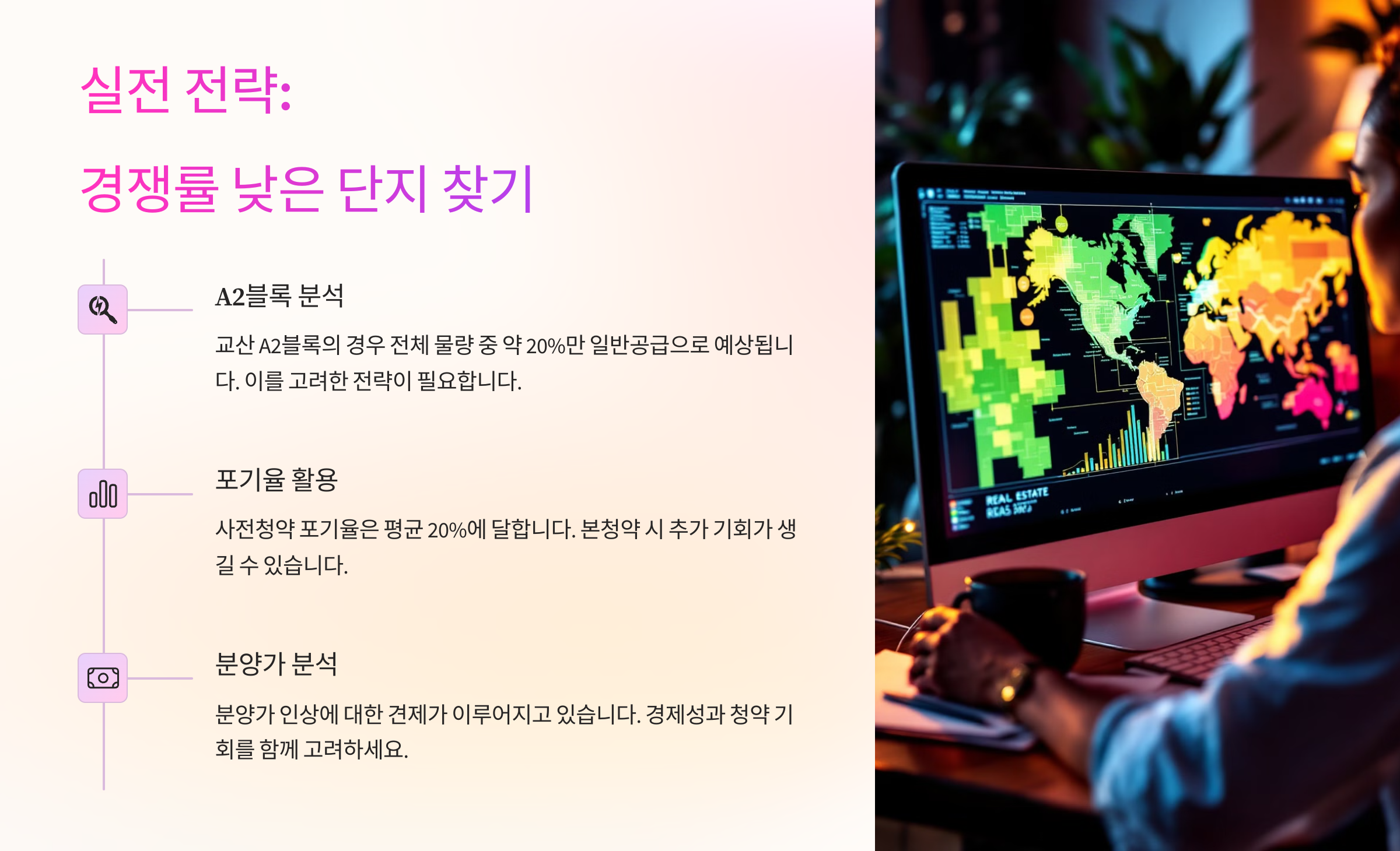 교산신도시 청약에서 전략적으로 접근하려면 경쟁률 낮은 단지를 선별해야 해요. 입지 조건, 평형 구성, 분양가에 따라 경쟁률은 천차만별이에요. 인기 있는 중심부 단지보다는 외곽이거나 중대형 평형 중심 단지를 공략하는 게 당첨 확률을 높이는 비결이에요.
