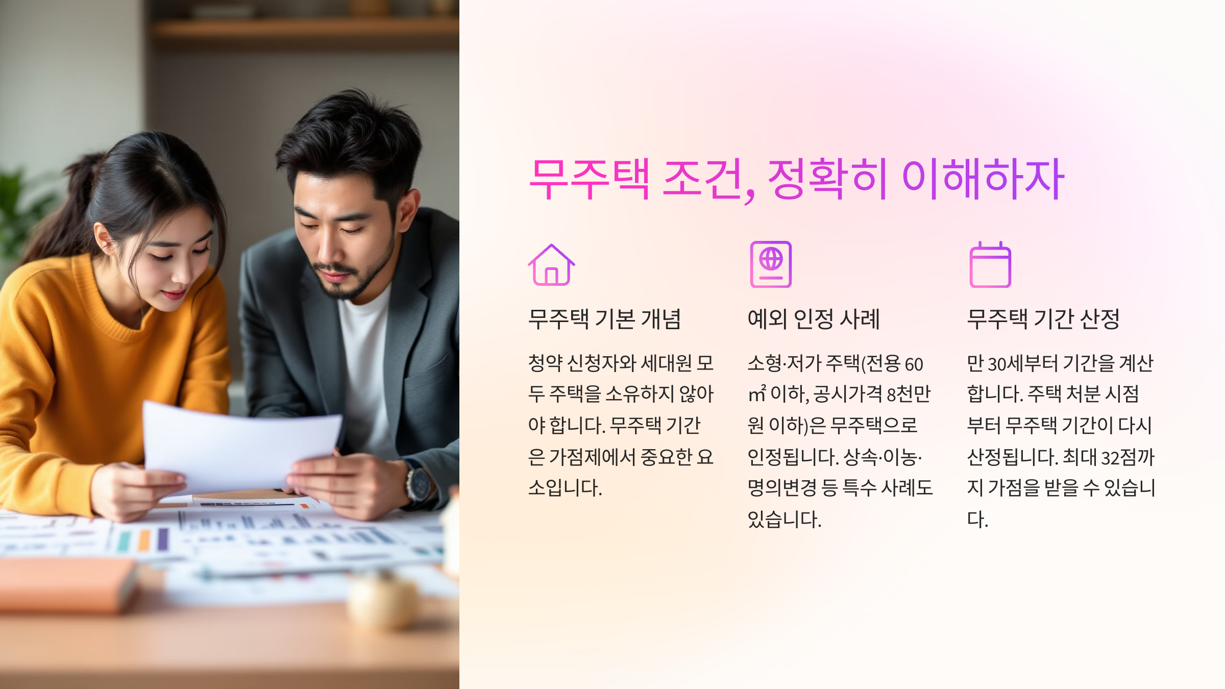청약의 시작은 바로 무주택 요건 충족이에요. 공공분양, 특별공급은 물론이고 민간분양에서도 추첨제 외 대부분이 무주택자를 우선해요. 무주택 기간이 길수록 가점도 높아지기 때문에, 주택 처분 시기도 전략적으로 조율하는 게 중요해요.