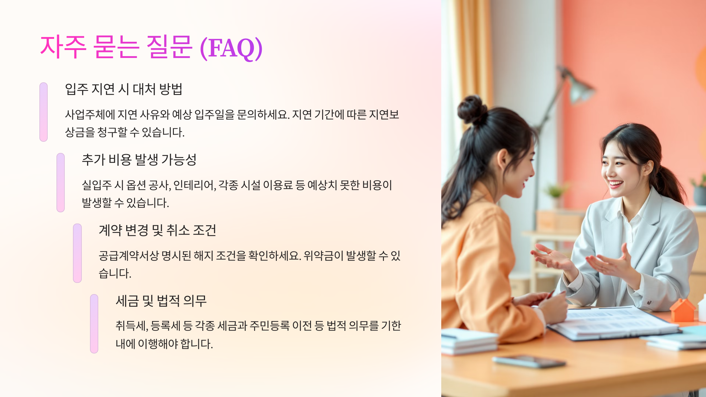 잔금 납부도 매우 중요한 절차예요. 분양가 중 계약금과 중도금을 제외한 나머지를 입주 전까지 완납해야 해요. 대부분 이 시점에 주택담보대출을 이용해서 잔금을 납부하게 되는데, 대출 실행 일정도 함께 맞춰야 해요.