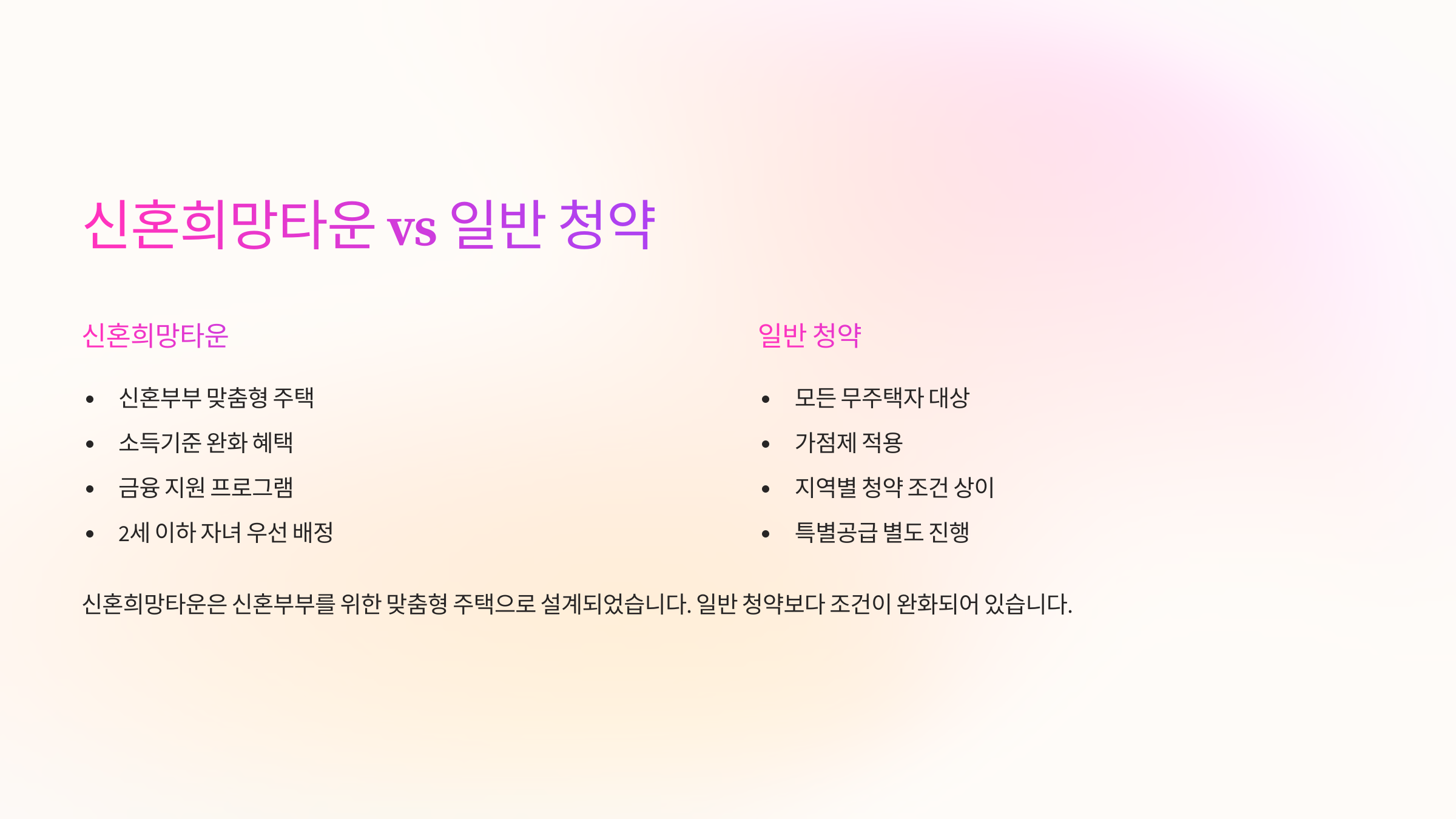 신혼희망타운은 말 그대로 '신혼부부'를 위한 특별한 주택 유형이에요. 일반 청약과 가장 큰 차이는 바로 대상자와 자금 조건이에요. 혼인 7년 이내 또는 예비부부가 신청 가능하며, 아이가 있다면 가산점도 받을 수 있어요. 일반 청약보다 낮은 경쟁률과 자격 문턱이 특징이죠.