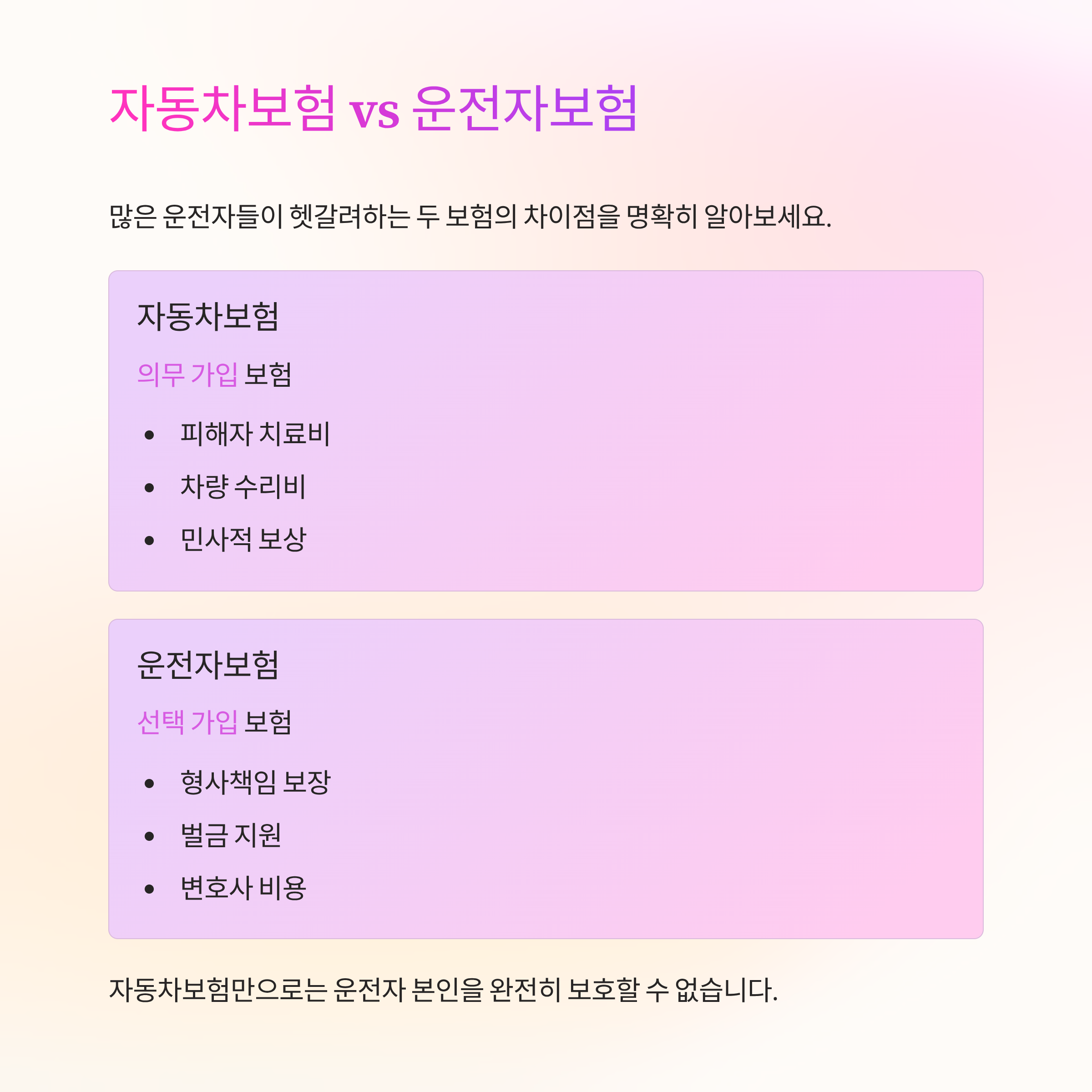 자동차보험은 피해자에 대한 치료비, 차량 수리비 등 민사적 배상을 목적으로 해요. 반대로 운전자보험은 형사합의금, 벌금, 변호사비용 등 **운전자 본인**이 책임져야 하는 법적 비용을 보장해줘요. 이 점이 가장 큰 차이점이에요.