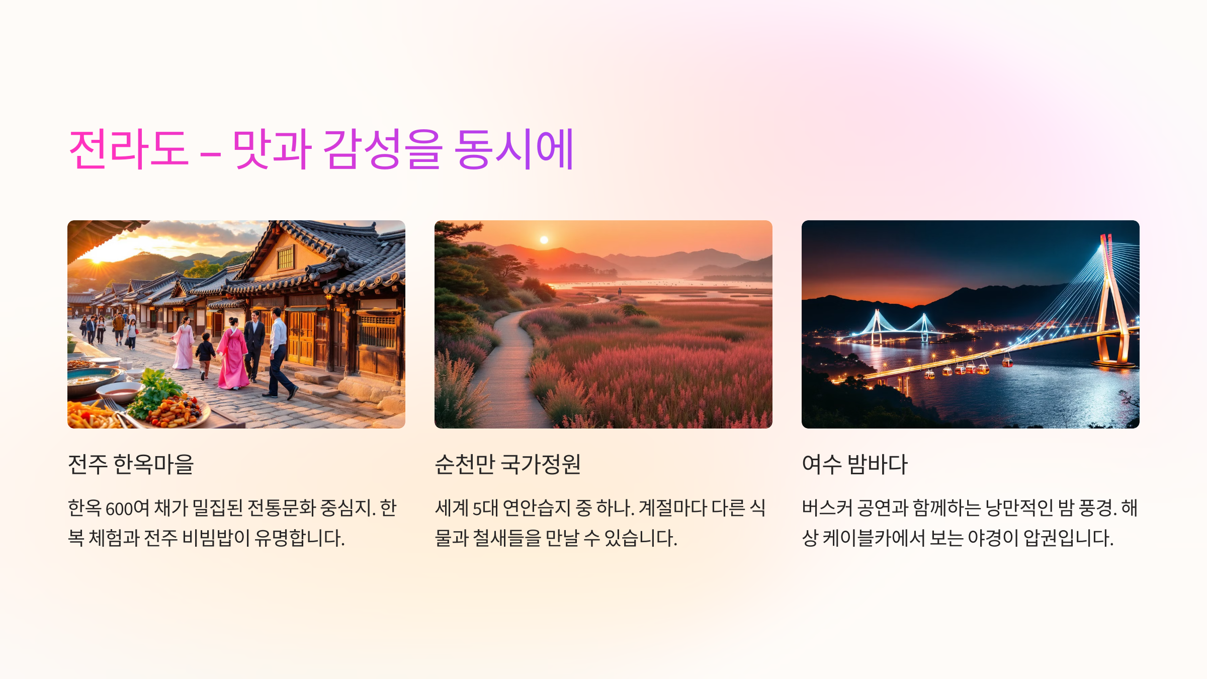 전라도는 맛있는 음식과 전통적인 감성을 동시에 즐길 수 있는 여행지예요. ✨ 한옥과 드넓은 자연이 어우러져 있어서 힐링 여행으로도 딱이에요!