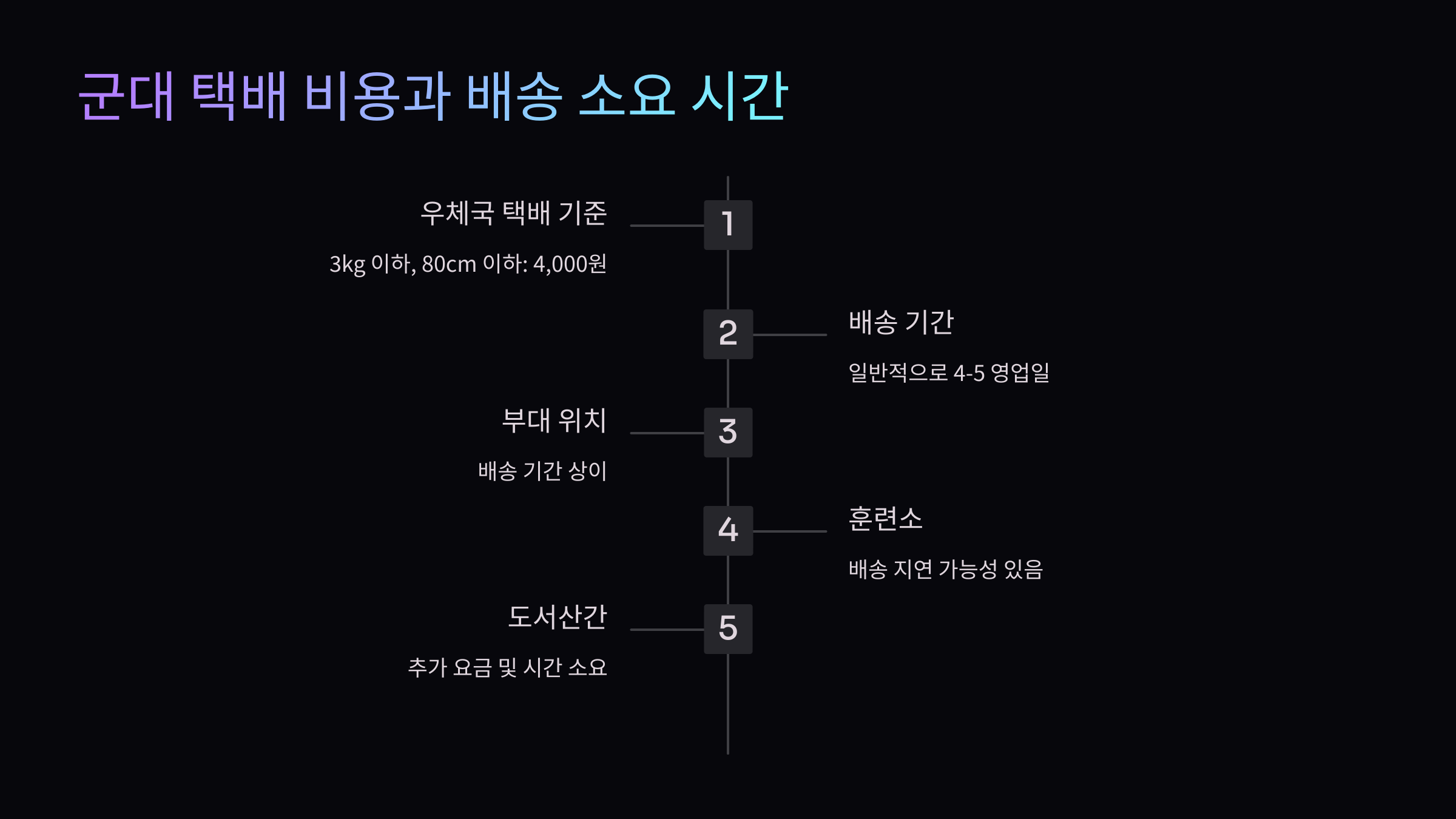 - 주말/공휴일 – 일부 부대는 주말과 공휴일에는 택배를 받지 않아요.