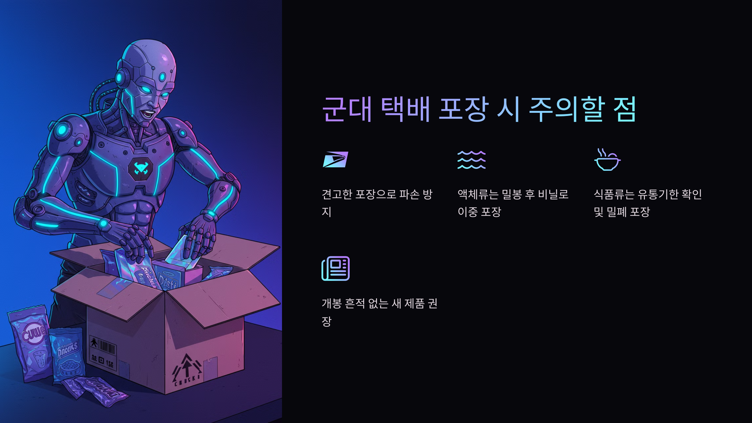 - 방수 처리 필수 – 군부대는 야외에서 택배를 보관할 수도 있기 때문에, 비닐로 감싸는 것이 좋아요.