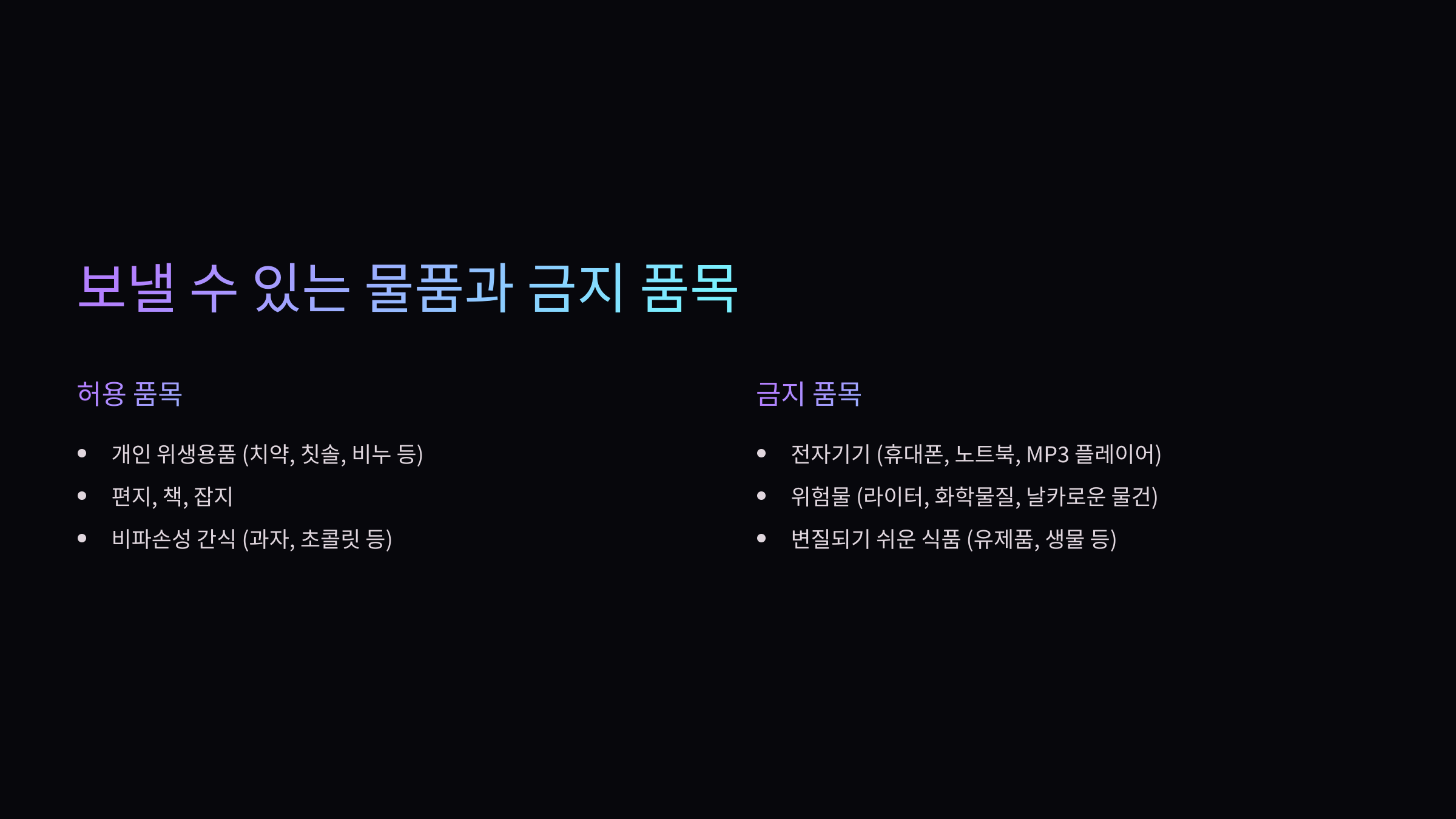 - 금지 품목 포함 – 반입 금지된 전자기기, 주류 등이 포함된 경우.