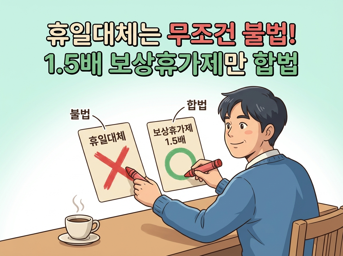 근무자의날 대체휴무 불법 및 1.5배 보상휴가제 가능 여부 인포그래픽