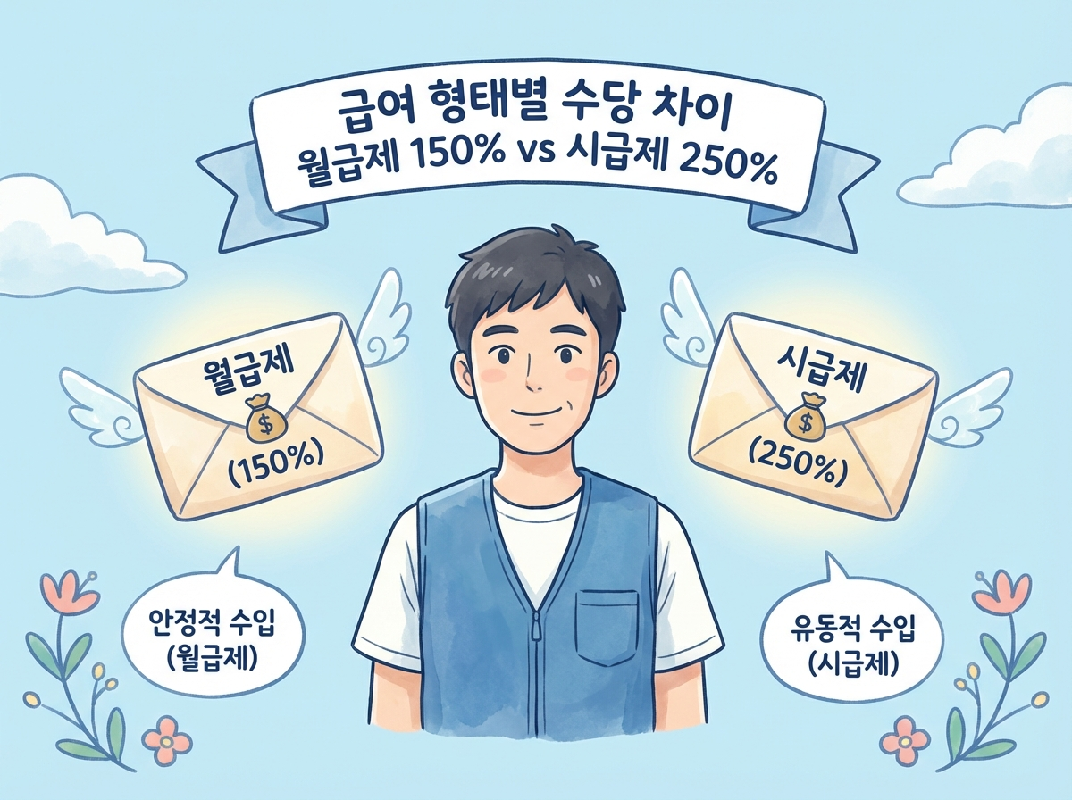 월급제 직원은 이미 유급휴일수당이 기본급에 녹아있으므로, 당일 근로 시 근로임금(100%) + 가산수당(50%) = 150%만 추가로 지급받습니다. 반면 단기 알바나 일용직 같은 시급제는 유급수당(100%)이 포함되어 있지 않아 당일 총 250%의 임금을 받게 됩니다.