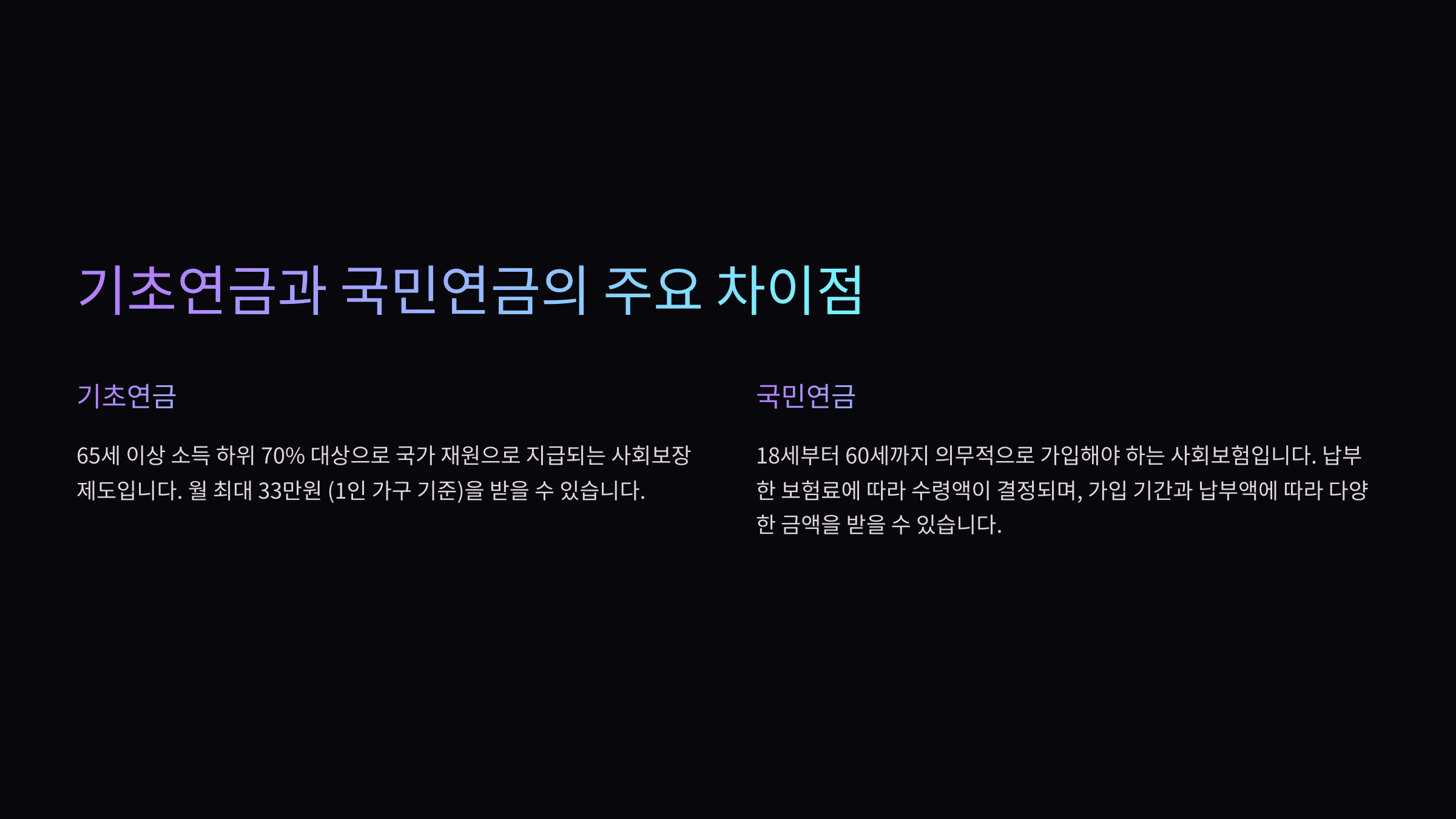 - 가입 방식: 국민연금은 의무가입, 기초연금은 신청해야 받을 수 있음
