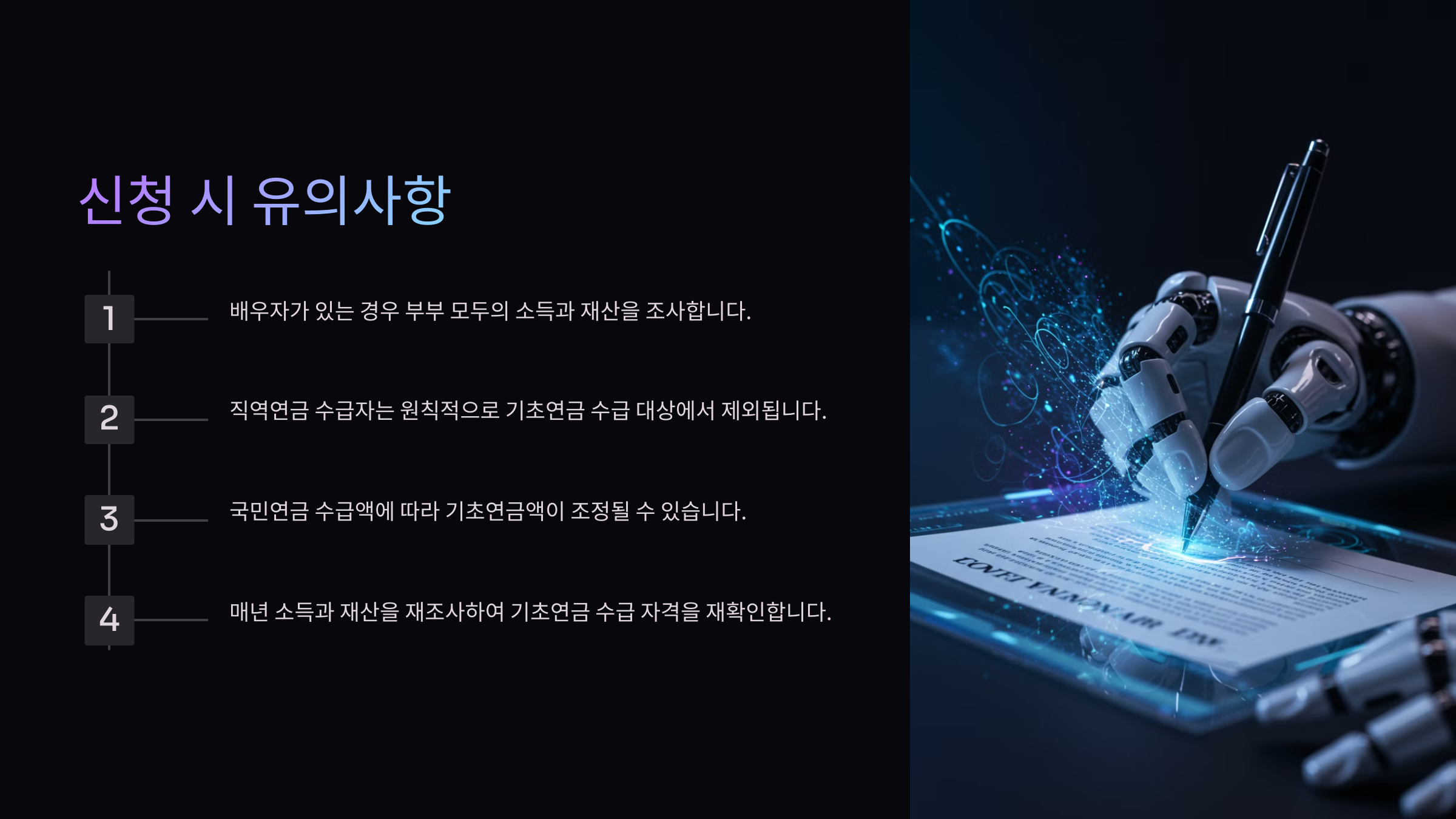 또한, 기초연금은 한 번 신청하면 끝나는 것이 아니라 정기적인 재심사가 이루어지므로, 신청 후에도 계속 신경 써야 해요. 신청 과정에서 실수하지 않도록 주요 유의사항을 정리해 볼게요.