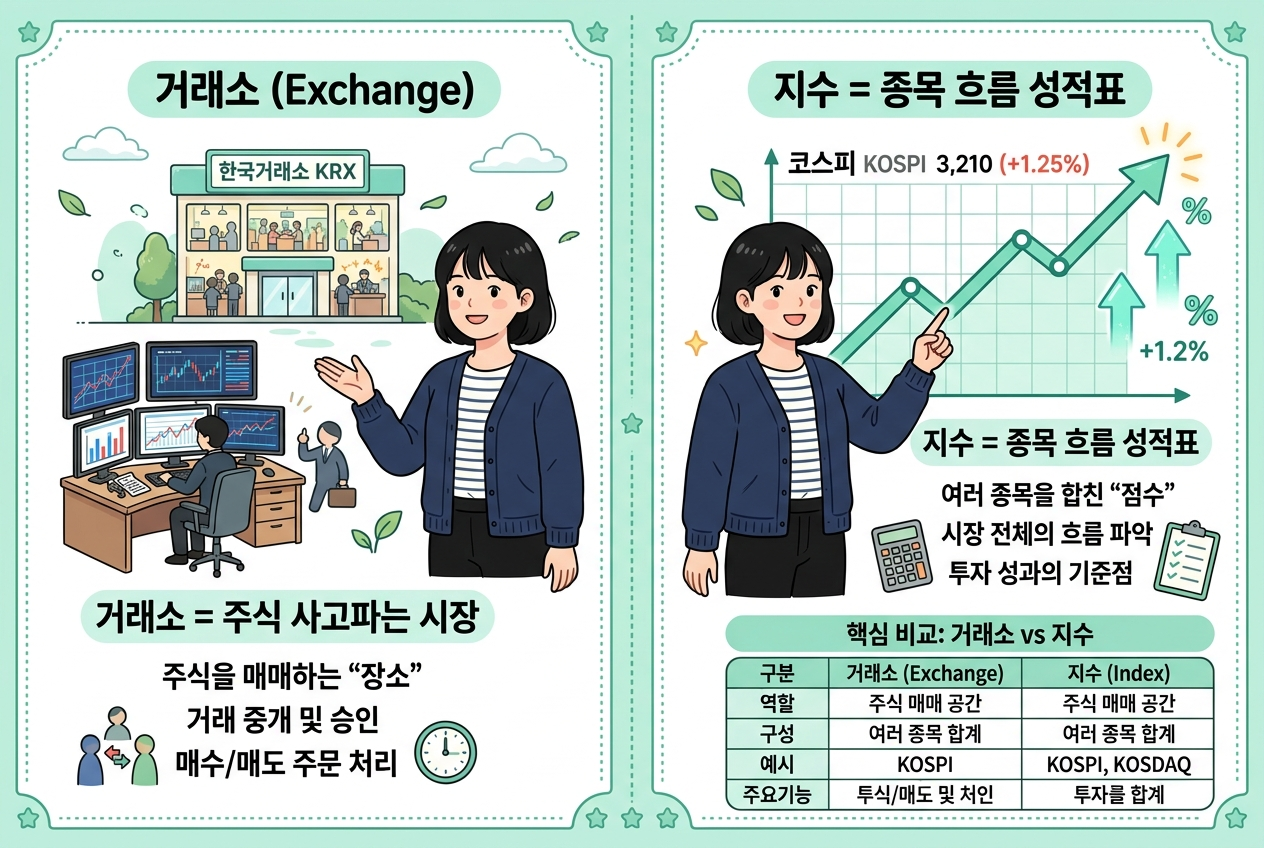 거래소는 주식이 거래되는 장소이고, 지수는 여러 종목의 흐름을 숫자로 보여주는 성적표에 가까워요.