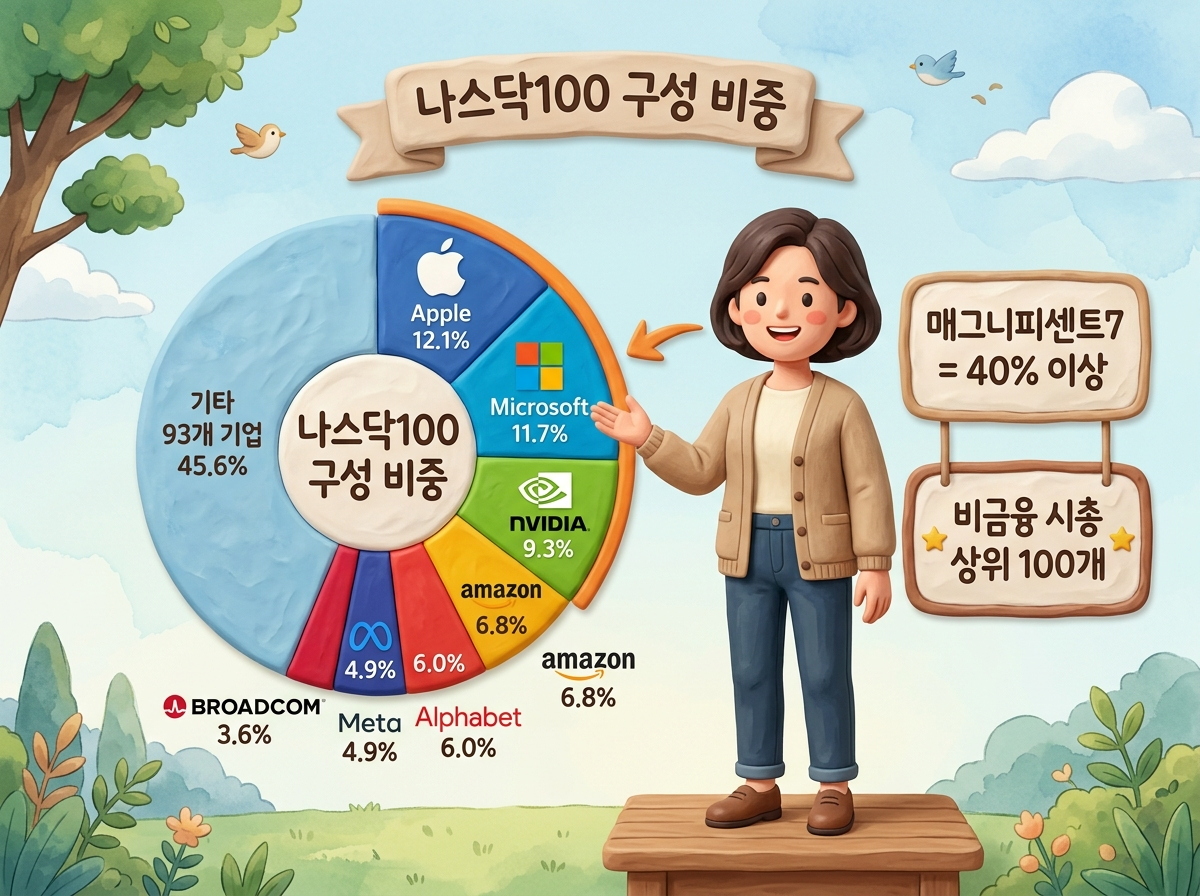 2026년 기준 비중 상위 종목은 애플, 마이크로소프트, 엔비디아, 아마존, 메타, 알파벳(구글), 브로드컴 등 이른바 '매그니피센트 7'이 전체 지수의 약 40% 이상을 차지하고 있어요. 이 말은 소수 대형주 흐름에 지수 전체가 크게 영향받는다는 뜻이기도 합니다.