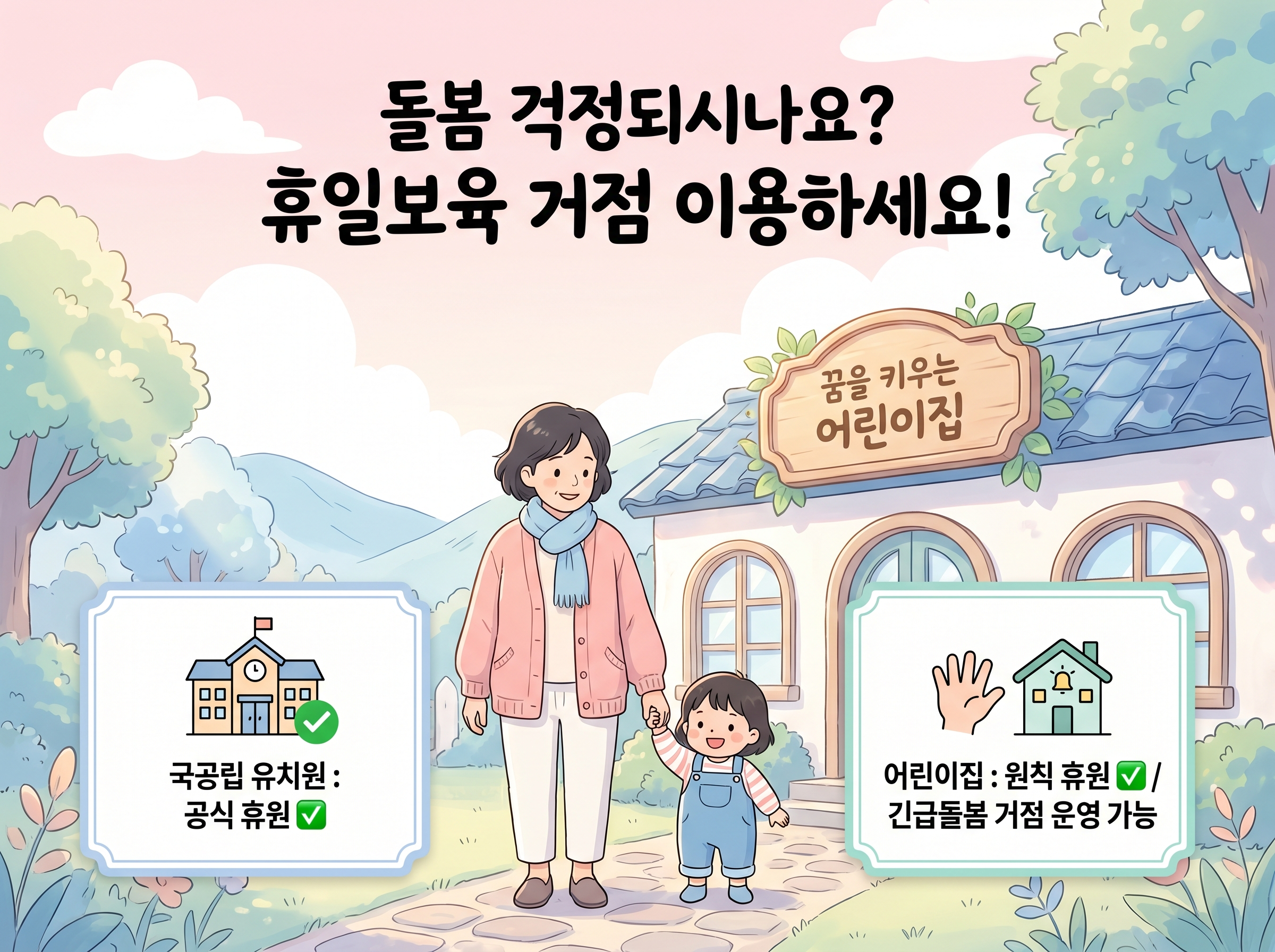 A2. 2026년부터 어린이집도 원칙적으로 휴원이에요. 다만 맞벌이 가정을 위한 지역별 휴일 보육 거점 기관이 운영될 수 있으니, 복지로(www.bokjiro.go.kr) 또는 지역 주민센터를 통해 신청하시면 됩니다.