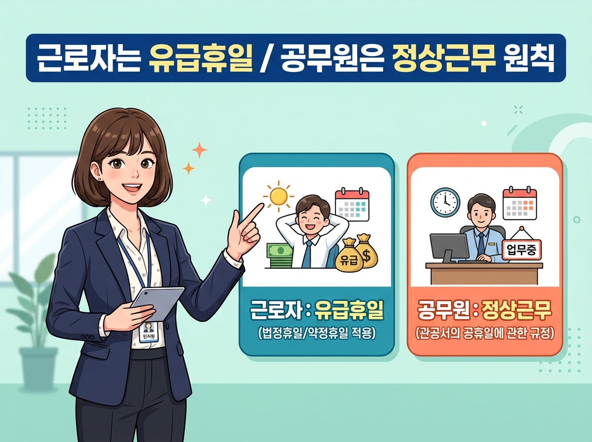 가장 혼란스러운 부분은 공공기관입니다. 공무원은 근로기준법이 아닌 국가공무원법 및 지방공무원법의 적용을 받으므로 원칙적으로 정상 근무를 합니다.