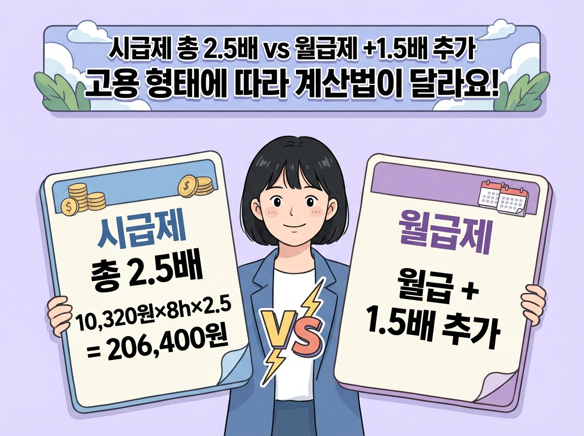 "나는 2.5배를 다 받는 건가요?"라는 질문을 정말 많이 받는데, 사실 고용 형태에 따라 체감하는 숫자가 다르게 느껴질 수 있어요. 시급제와 월급제의 계산 구조가 다르기 때문이에요.