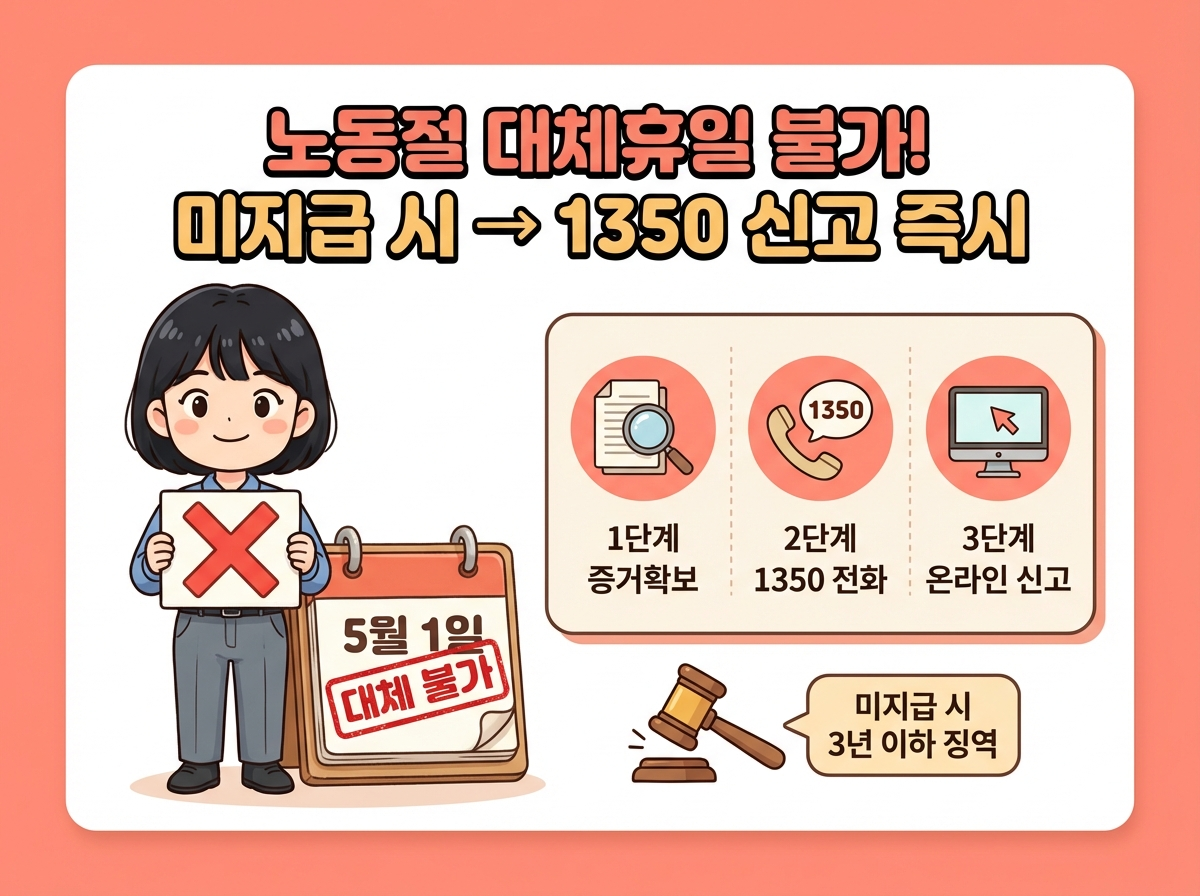 노동절은 대체휴일이 적용되지 않고, 미지급 시 사업주는 법적 처벌을 받을 수 있어요. 근무 후 급여명세서를 꼭 확인하시고, 수당이 제대로 지급되지 않았다면 고용노동부 1350으로 문의하거나 온라인 신고를 활용해 보세요. 내 권리는 내가 챙겨야 한답니다!