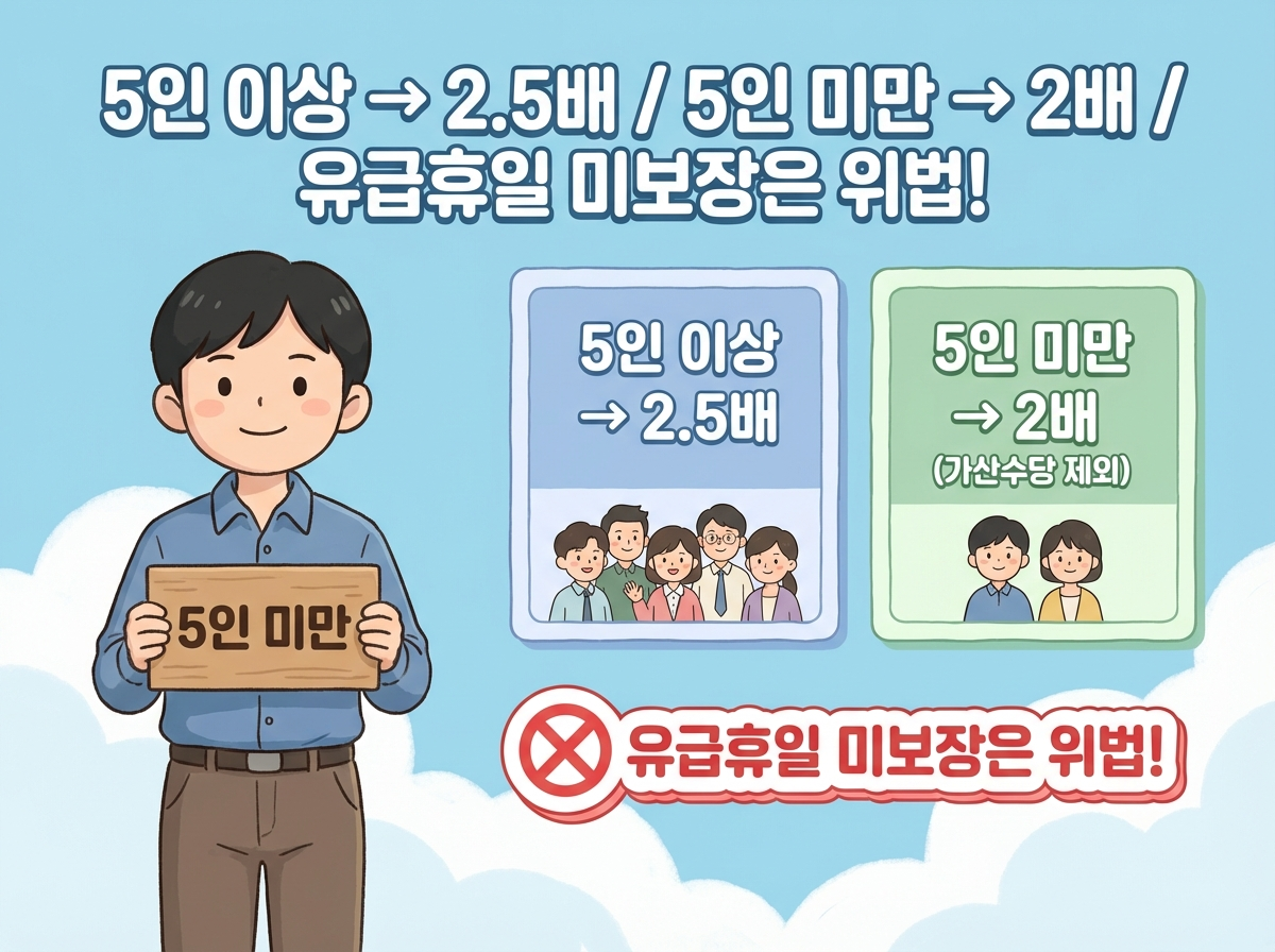 - ✔ 5인 미만이라도 유급휴일 미보장은 위법 — 쉬어도 임금 지급 필수