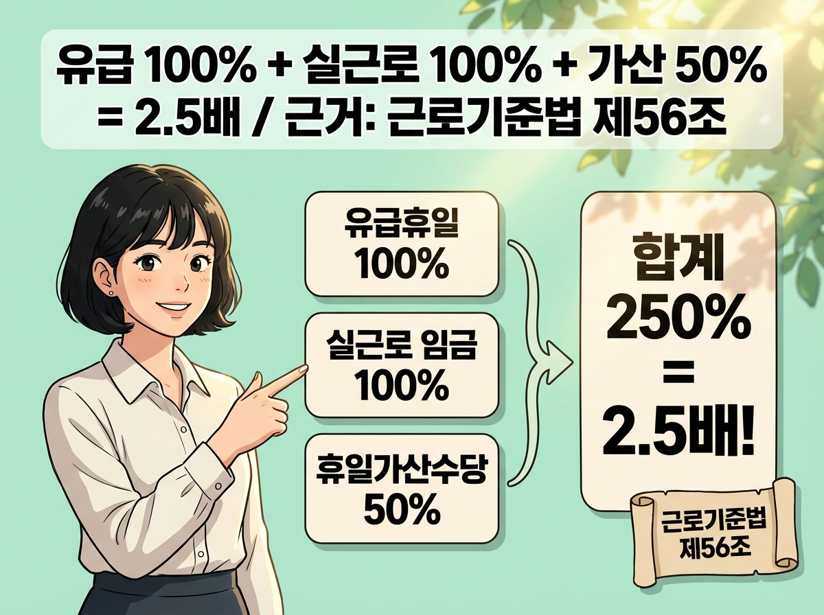 여기에 실제로 근무를 하게 되면 두 가지가 더 붙어요. 근무한 시간에 대한 실근로 임금 100%와, 휴일에 일한 것에 대한 가산수당 50%가 추가되는 구조랍니다. 이 세 가지를 합치면 바로 250%, 즉 2.5배가 되는 거예요.