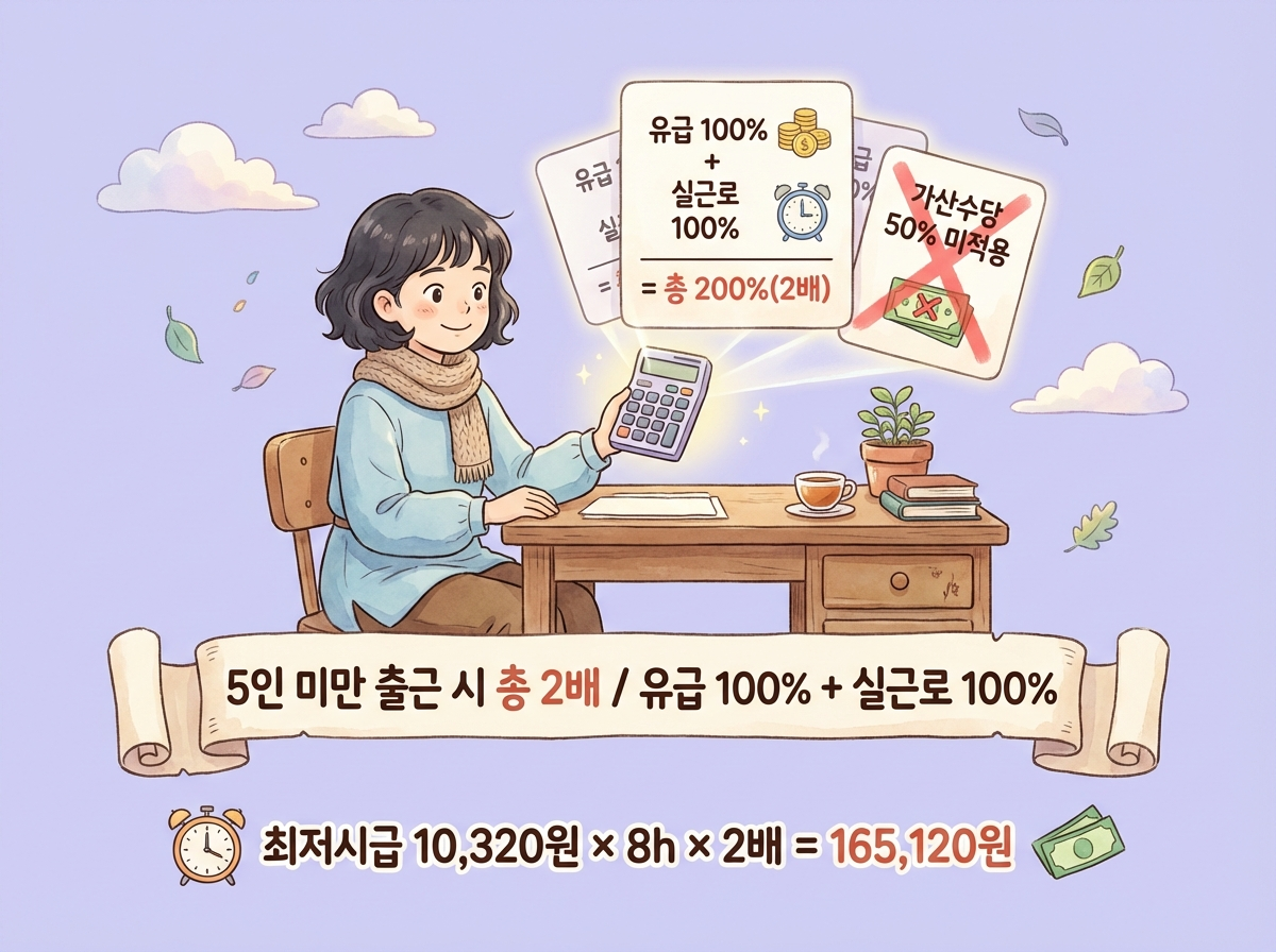 A2. 2026년 최저시급 기준으로 8시간 근무 시 10,320원 × 8시간 × 2배 = 165,120원을 받아야 해요. 가산수당은 적용되지 않지만, 유급수당과 실근로 임금을 합산한 2배는 반드시 지급해야 합니다.