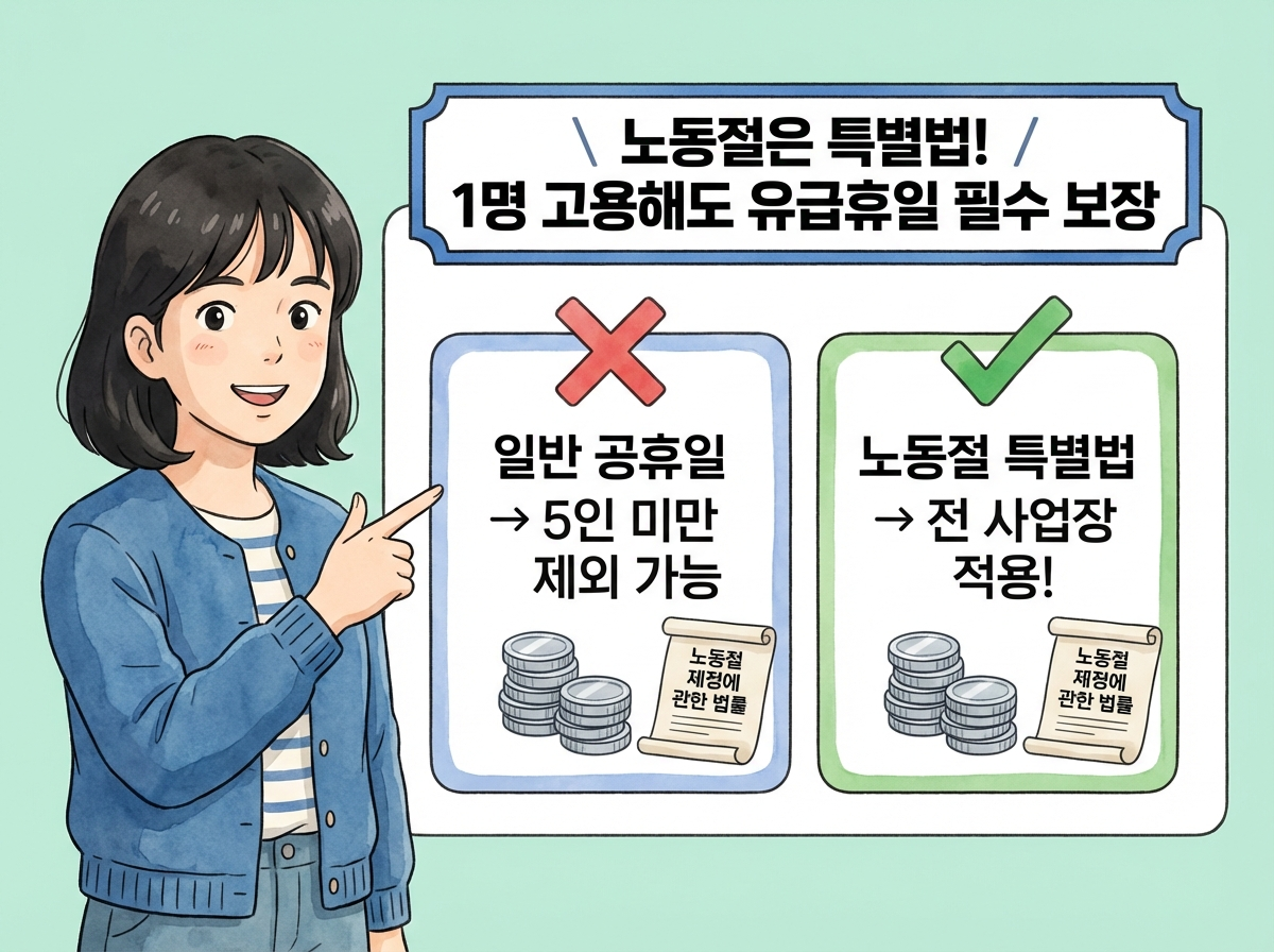일반적인 빨간 날(법정 공휴일)은 근로기준법에 의해 5인 미만 사업장에는 적용이 제외될 수 있어요. 그런데 노동절은 달라요. 노동절은 「노동절 제정에 관한 법률」이라는 별도의 특별법에 따라 규정된 휴일이기 때문에, 근로자를 단 1명만 고용해도 유급휴일을 보장해야 합니다.