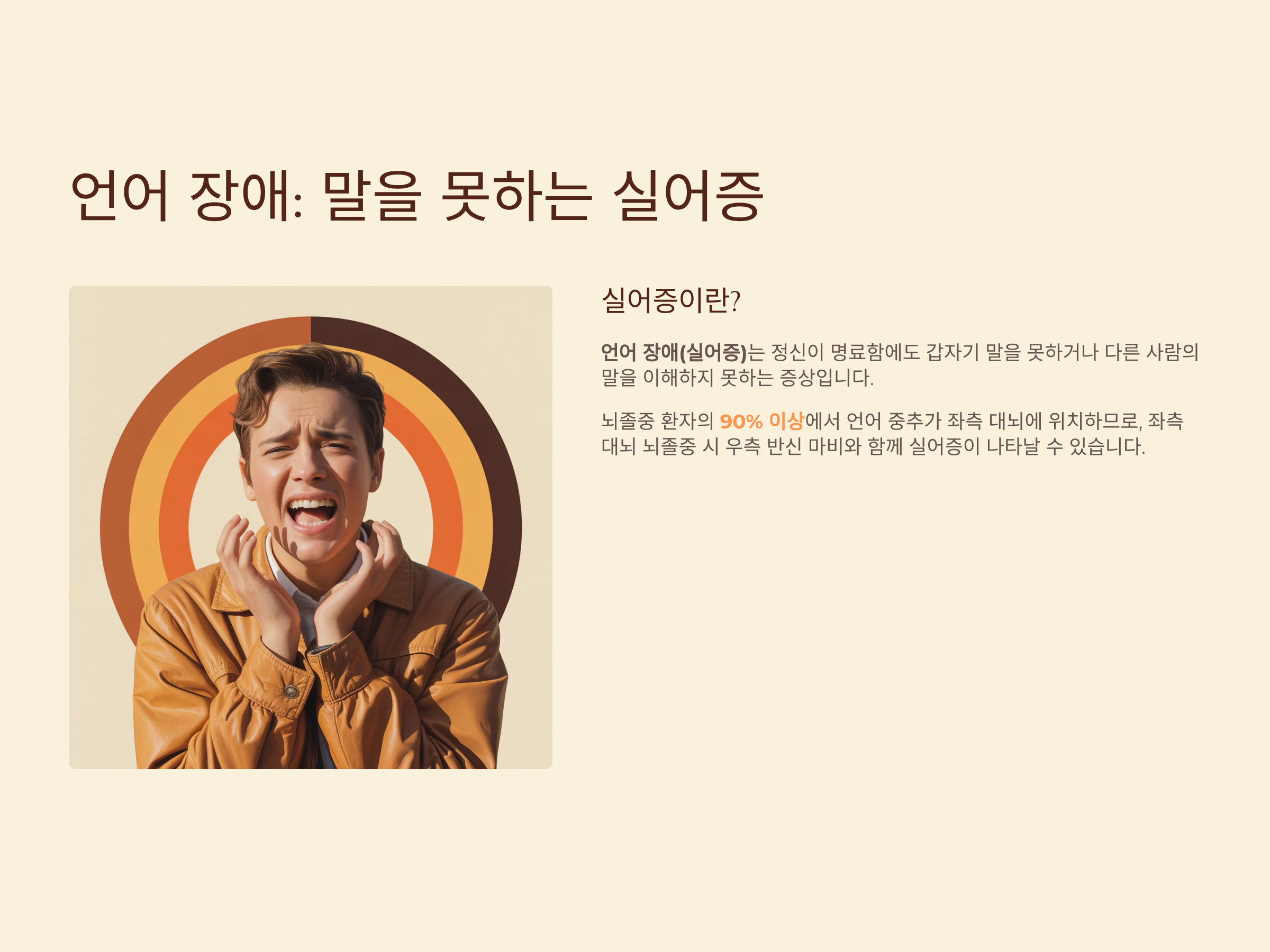 언어 장애(실어증)는 정신이 명료함에도 갑자기 말을 못하거나 다른 사람의 말을 이해하지 못하는 증상입니다. 뇌졸중 환자의 90% 이상에서 언어 중추가 좌측 대뇌에 위치하므로, 좌측 대뇌 뇌졸중 시 우측 반신 마비와 함께 실어증이 나타날 수 있습니다.