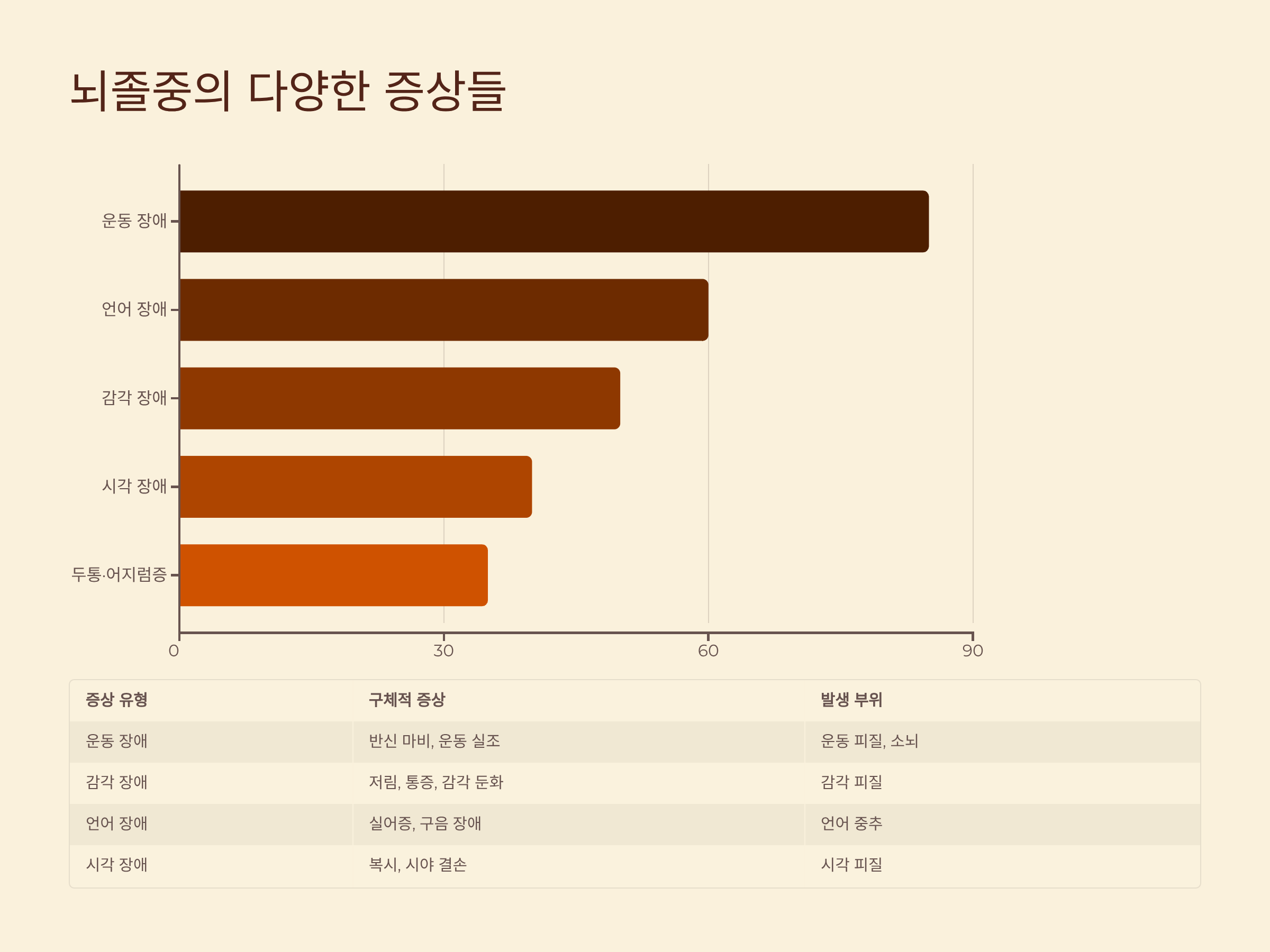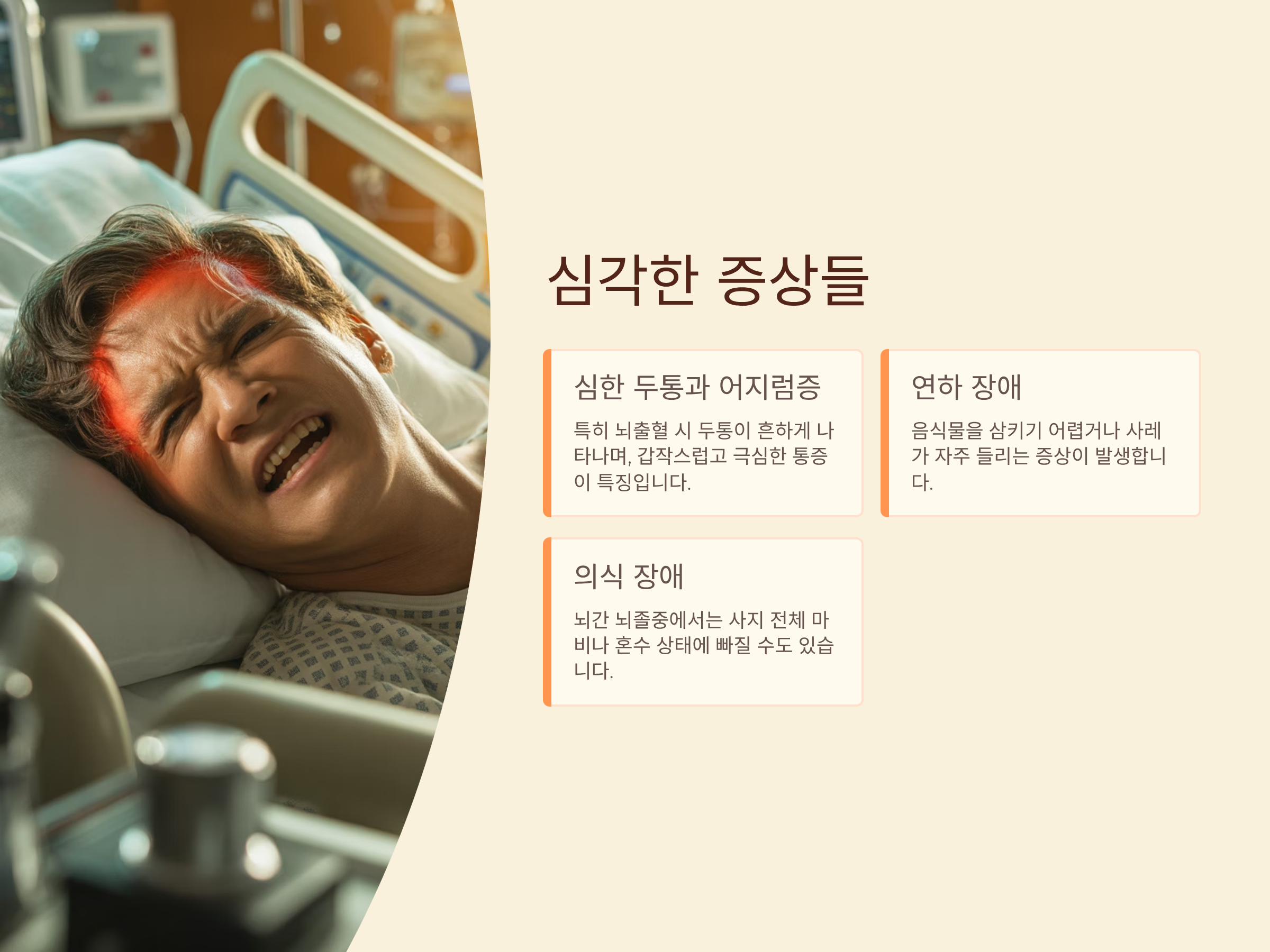 그 외에도 심한 두통과 어지럼증, 연하 장애로 인한 사레 들림, 의식 장애 등이 나타날 수 있습니다. 특히 뇌출혈 시 두통이 흔하며, 뇌간 뇌졸중에서는 사지 전체 마비나 혼수 상태에 빠질 수도 있습니다.