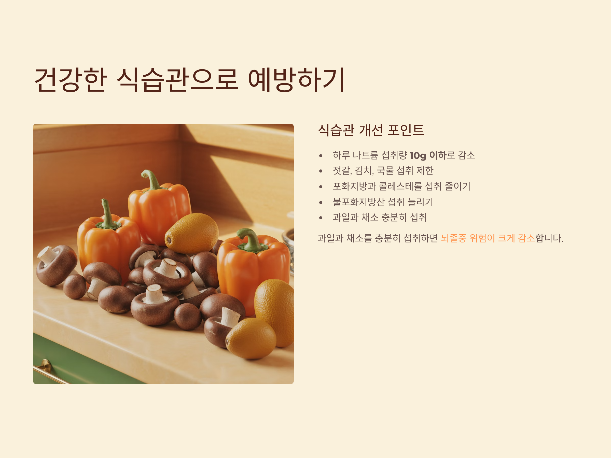 식습관 개선이 매우 중요합니다. 하루 나트륨 섭취량을 10g 이하로 줄이고, 젓갈, 김치, 국물 섭취를 제한해야 합니다. 포화지방과 콜레스테롤 섭취를 줄이고 불포화지방산 섭취를 늘리며, 과일과 채소를 충분히 섭취하면 뇌졸중 위험이 크게 감소합니다.