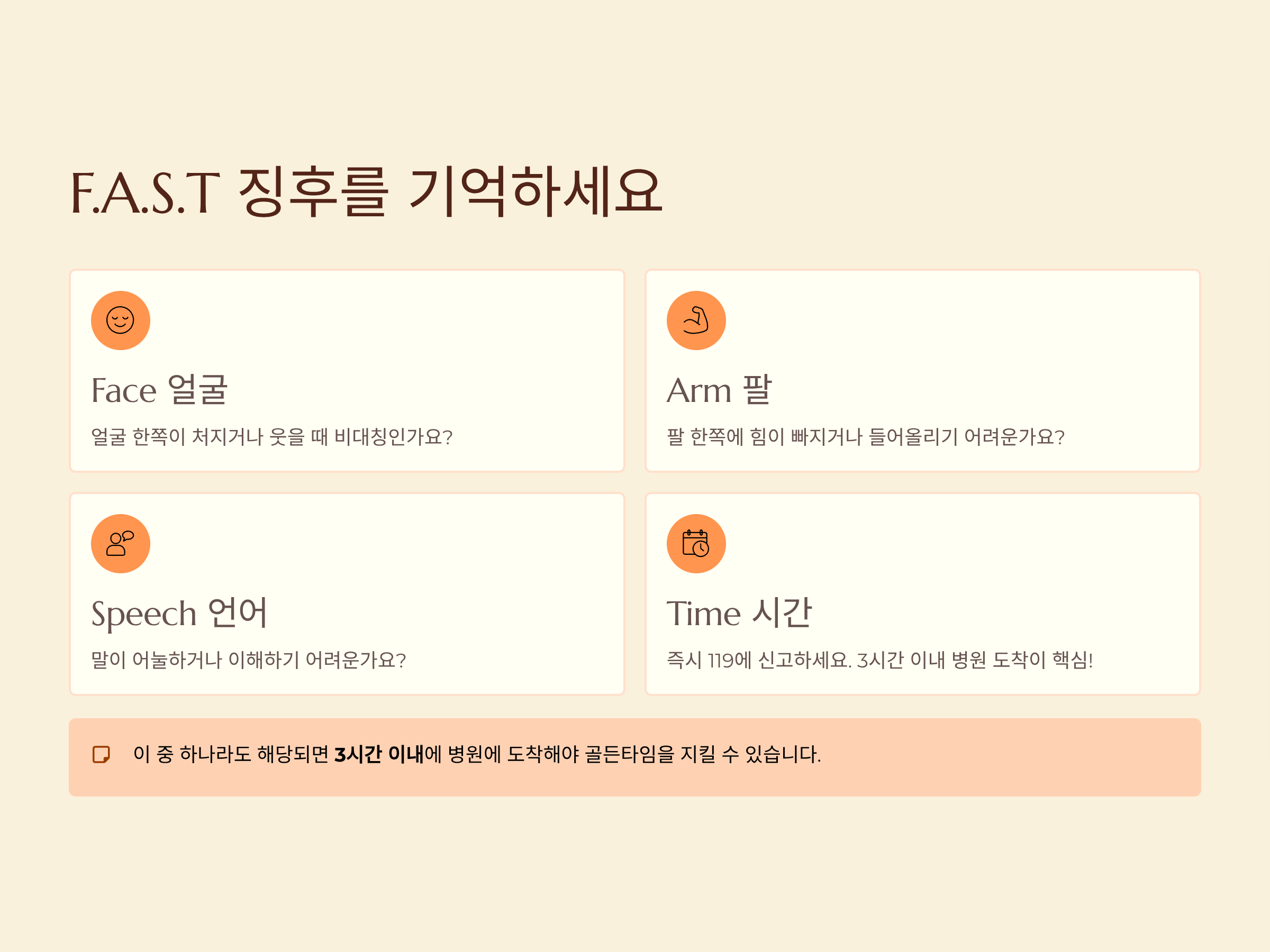 뇌졸중 의심 시 F.A.S.T 징후를 기억해야 합니다. F(Face)는 얼굴 한쪽이 처지는지, A(Arm)는 팔 한쪽에 힘이 빠지는지, S(Speech)는 말이 어눌해지는지, T(Time)는 즉시 119에 신고하라는 의미입니다. 이 중 하나라도 해당되면 3시간 이내에 병원에 도착해야 골든타임을 지킬 수 있습니다.