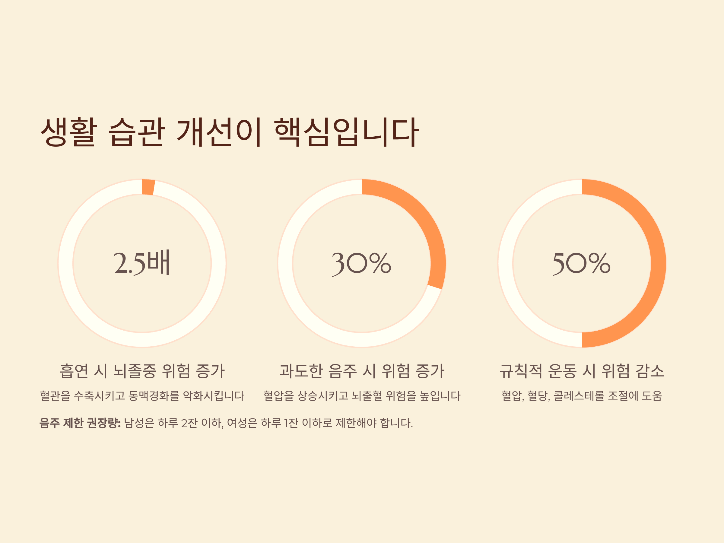 흡연은 혈관을 수축시키고 동맥경화를 악화시켜 뇌졸중 위험을 2.5배 이상 높이므로 반드시 금연해야 합니다. 과도한 음주도 혈압을 상승시키고 뇌출혈 위험을 높이므로, 남성은 하루 2잔 이하, 여성은 하루 1잔 이하로 제한해야 합니다.