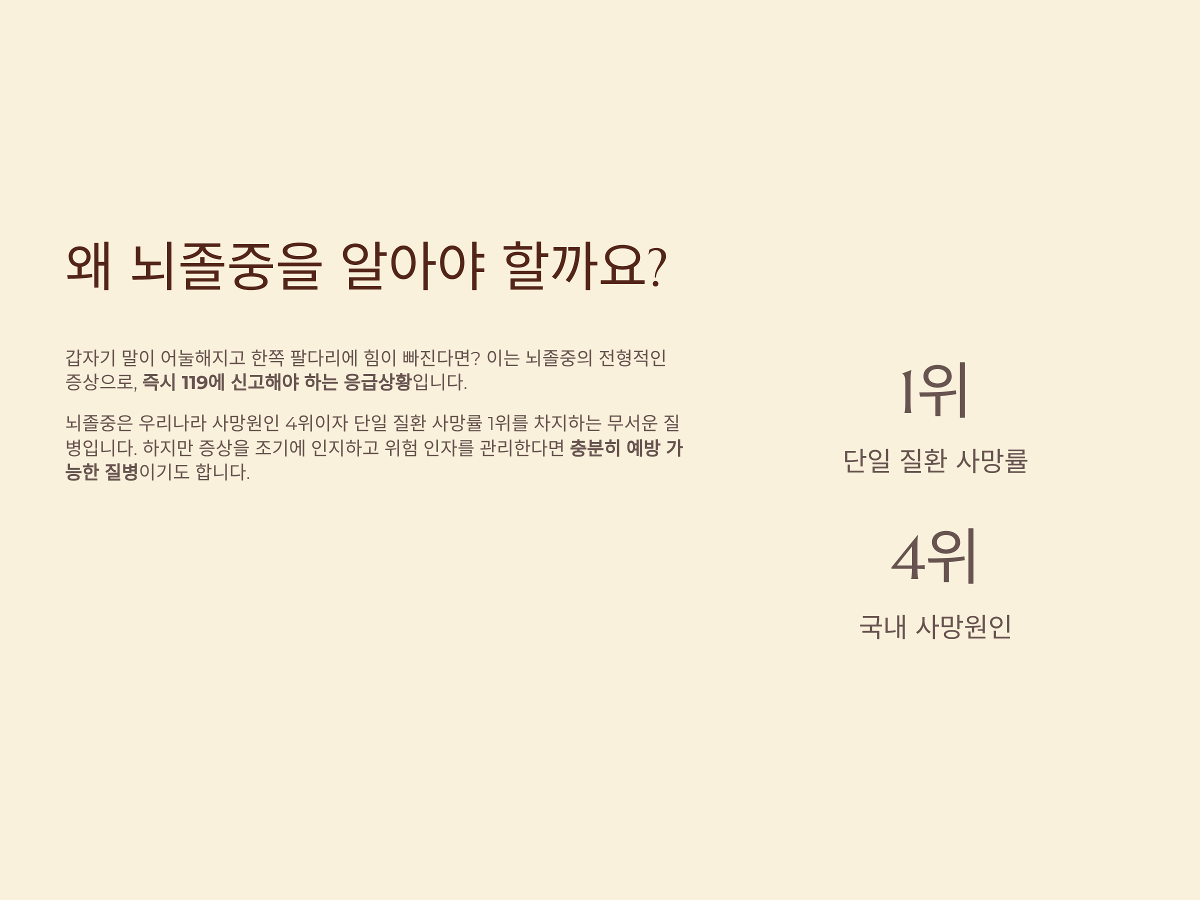 갑자기 말이 어눌해지고 한쪽 팔다리에 힘이 빠진다면 어떻게 해야 할까요? 이는 뇌졸중의 전형적인 증상으로, 즉시 119에 신고해야 하는 응급상황입니다. 뇌졸중은 우리나라 사망원인 4위이자 단일 질환 사망률 1위를 차지하는 무서운 질병입니다. 하지만 증상을 조기에 인지하고 위험 인자를 관리한다면 충분히 예방 가능한 질병이기도 합니다.