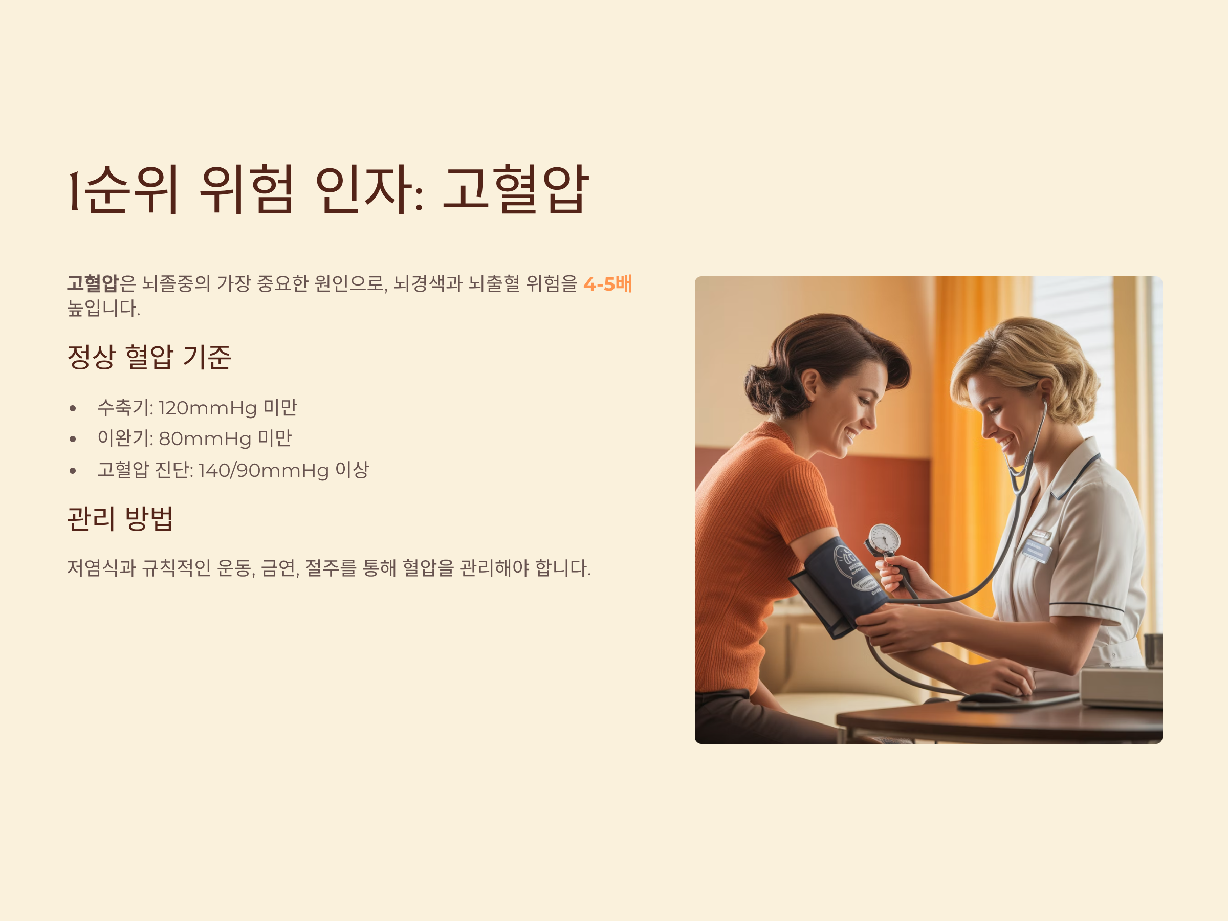 고혈압은 뇌졸중의 가장 중요한 원인으로, 뇌경색과 뇌출혈 위험을 4-5배 높입니다. 정상 혈압은 수축기 120mmHg 미만, 이완기 80mmHg 미만이며, 140/90mmHg 이상 시 고혈압으로 진단됩니다. 저염식과 규칙적인 운동, 금연, 절주를 통해 혈압을 관리해야 합니다.