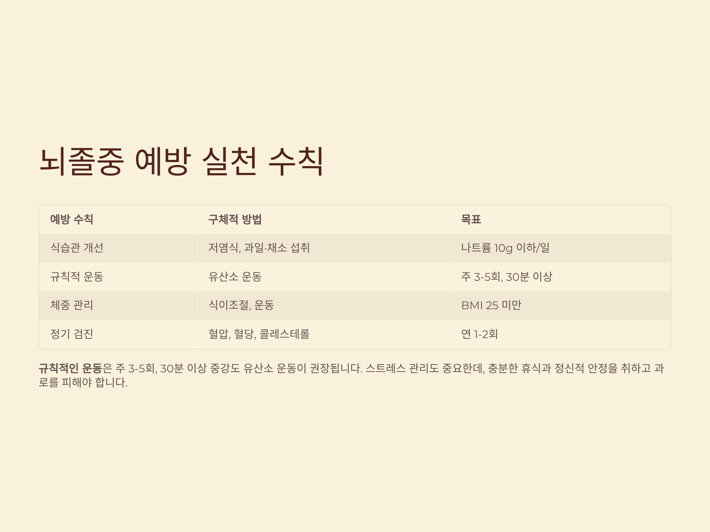식습관 개선이 매우 중요합니다. 하루 나트륨 섭취량을 10g 이하로 줄이고, 젓갈, 김치, 국물 섭취를 제한해야 합니다. 포화지방과 콜레스테롤 섭취를 줄이고 불포화지방산 섭취를 늘리며, 과일과 채소를 충분히 섭취하면 뇌졸중 위험이 크게 감소합니다.