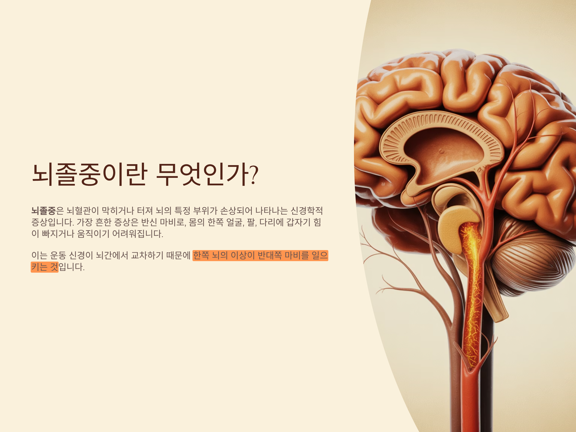 뇌졸중은 뇌혈관이 막히거나 터져 뇌의 특정 부위가 손상되어 나타나는 신경학적 증상입니다. 가장 흔한 증상은 반신 마비로, 몸의 한쪽 얼굴, 팔, 다리에 갑자기 힘이 빠지거나 움직이기 어려워집니다. 이는 운동 신경이 뇌간에서 교차하기 때문에 한쪽 뇌의 이상이 반대쪽 마비를 일으키는 것입니다.
