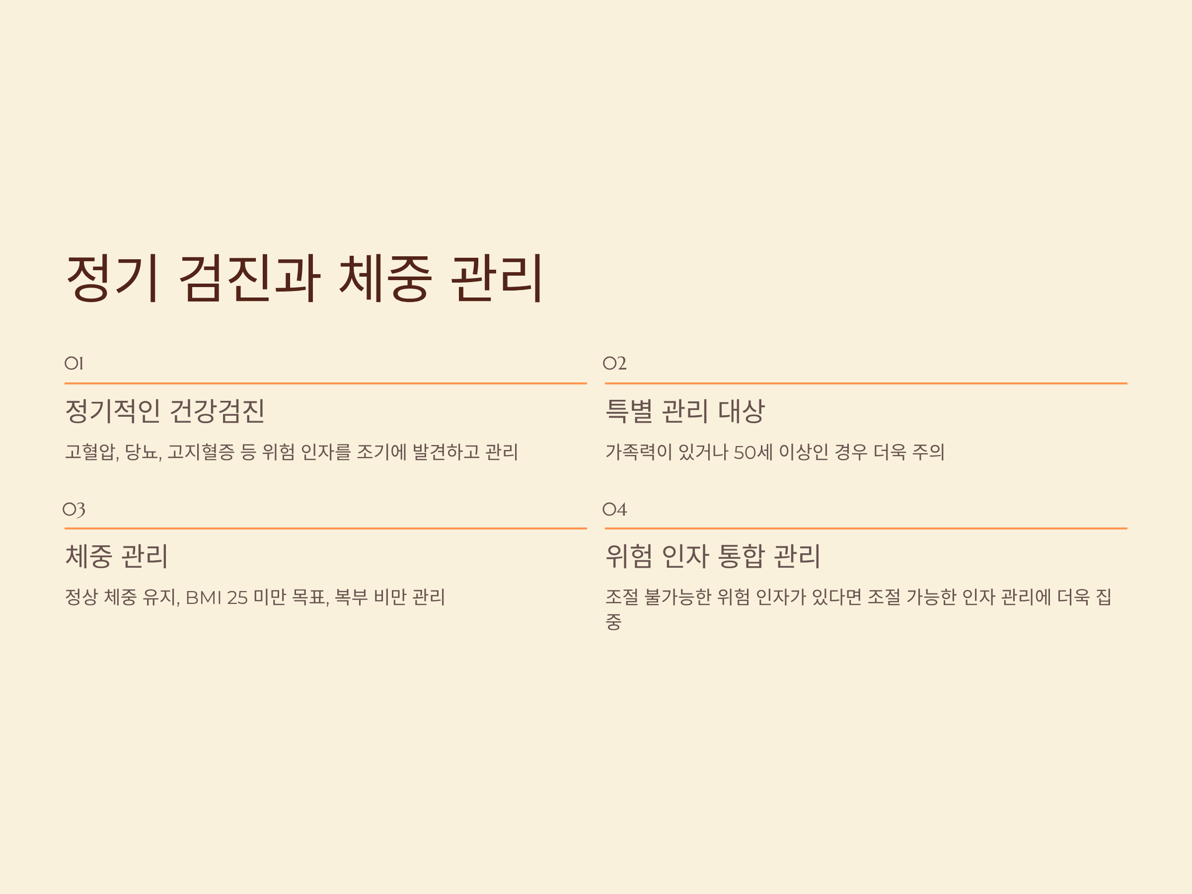 정기적인 건강검진을 통해 고혈압, 당뇨, 고지혈증 등 위험 인자를 조기에 발견하고 관리하는 것이 중요합니다. 특히 가족력이 있거나 50세 이상인 경우 더욱 주의가 필요합니다. 나이, 성별, 가족력 같은 조절 불가능한 위험 인자가 있다면 조절 가능한 위험 인자 관리에 더욱 신경 써야 합니다.