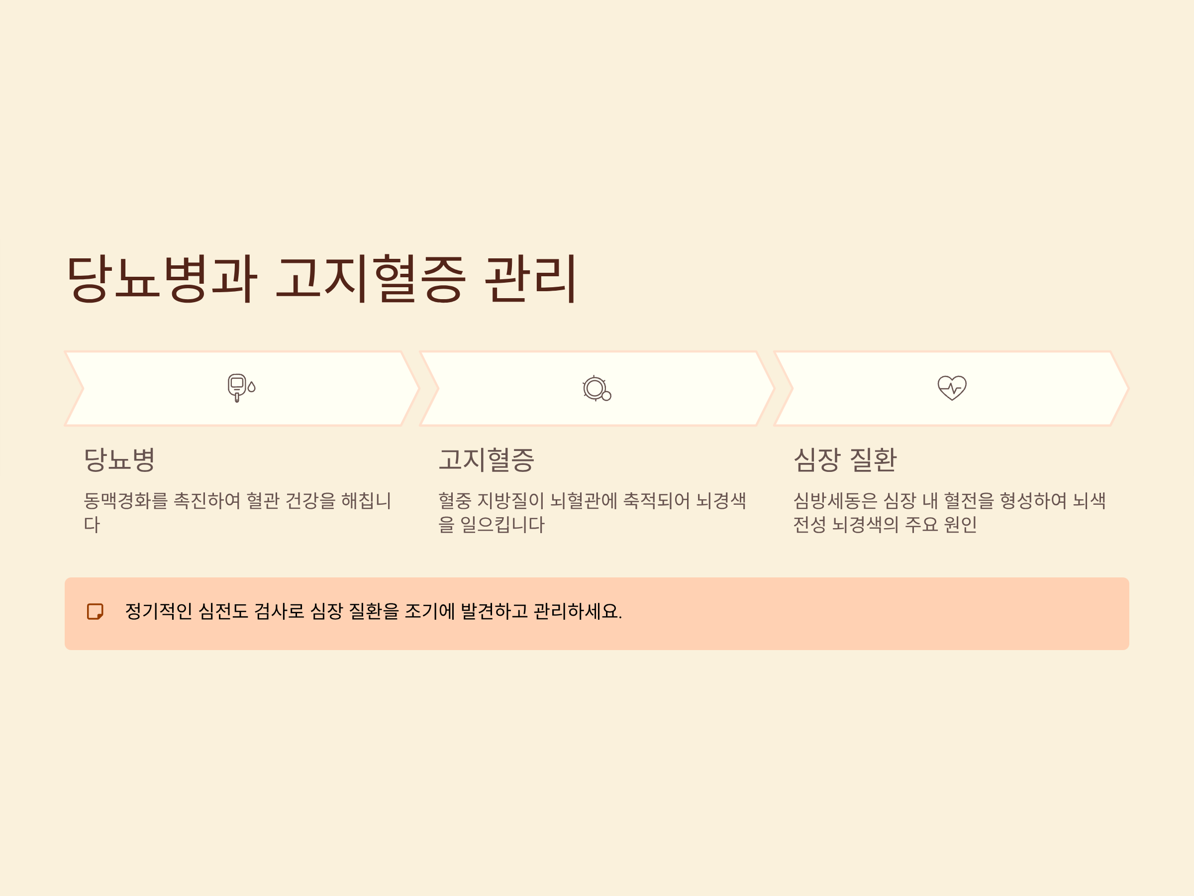 당뇨병과 고지혈증도 중요한 위험 인자입니다. 당뇨병은 동맥경화를 촉진하고, 고지혈증은 혈중 지방질이 뇌혈관에 축적되어 뇌경색을 일으킵니다. 심방세동 같은 심장 질환은 심장 내 혈전을 형성하여 뇌색전성 뇌경색의 주요 원인이 되므로 정기적인 심전도 검사가 필요합니다.