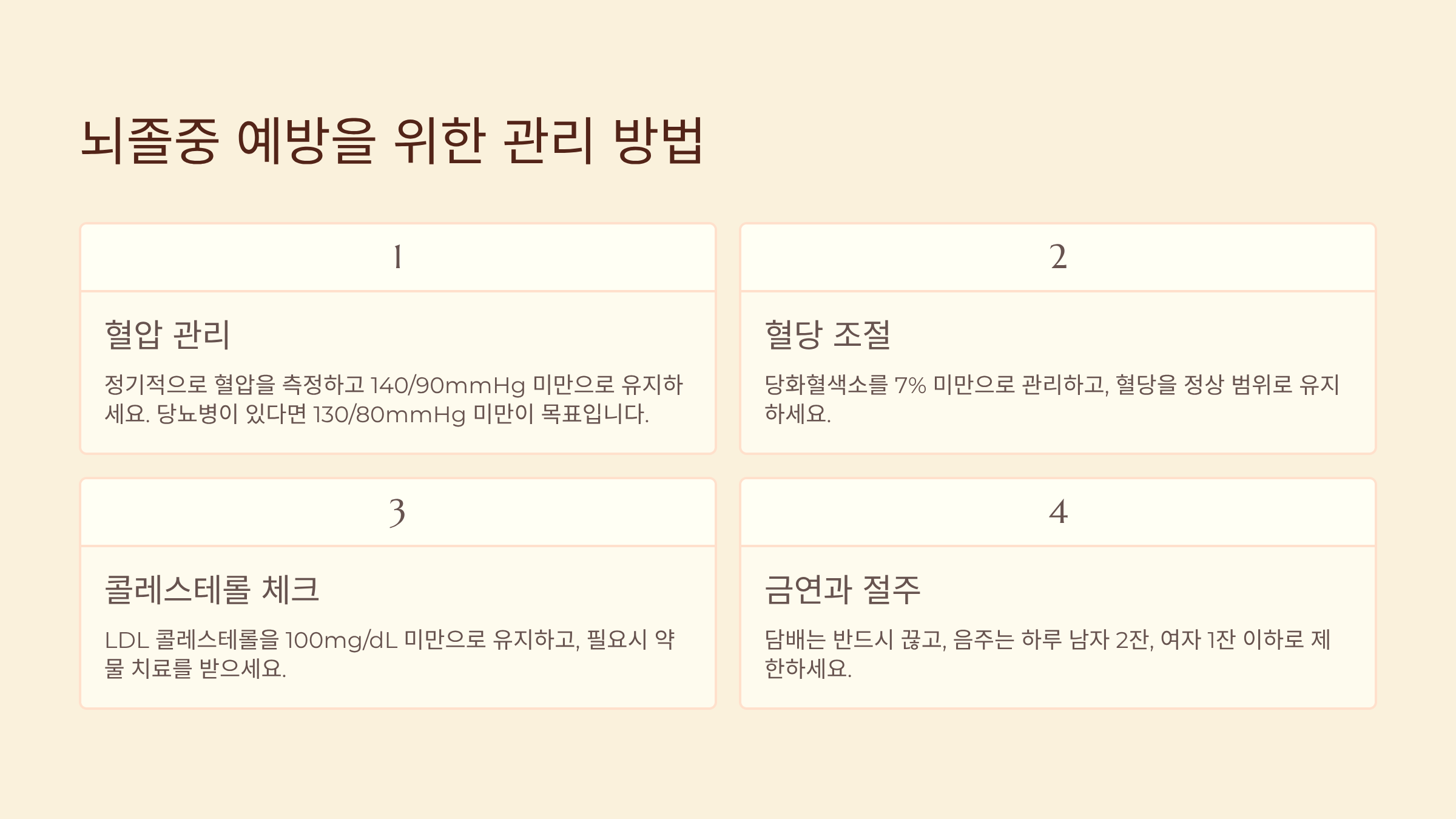 뇌졸중 예방의 핵심은 위험 인자를 철저히 관리하는 거예요. 고혈압이 있다면 정기적으로 혈압을 측정하고, 처방받은 약을 꾸준히 복용해야 해요. 목표 혈압은 140/90mmHg 미만이지만, 당뇨병이 있다면 130/80mmHg 미만으로 더 엄격하게 관리해야 해요.