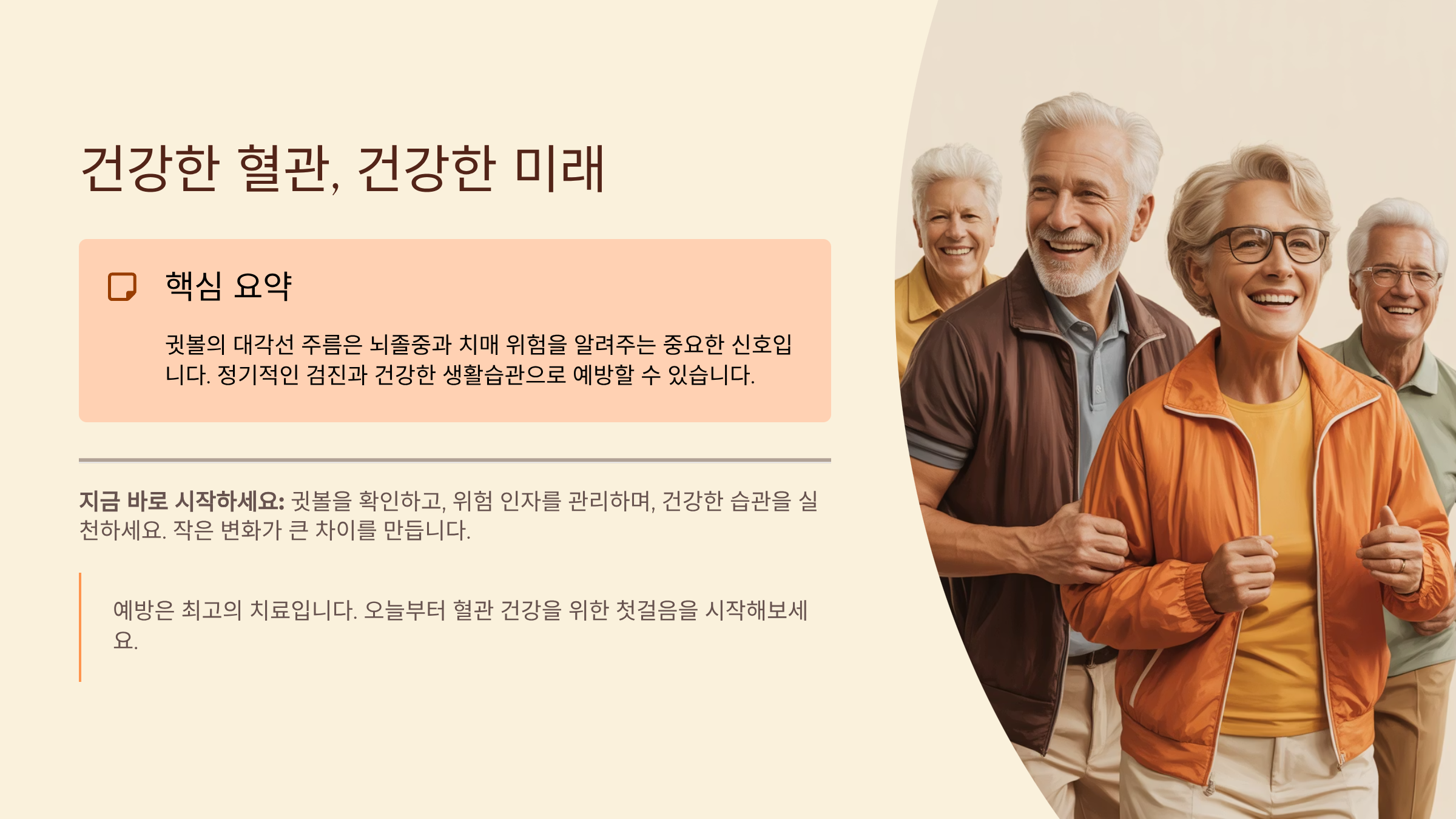 귓볼의 대각선 주름은 뇌졸중과 치매 위험을 알려주는 중요한 신호일 수 있어요. 뇌졸중은 골든타임 내 치료가 중요하므로 전조 증상을 숙지하고, 위험 인자를 철저히 관리해야 해요. 정기적인 검진과 건강한 생활습관으로 예방할 수 있어요.