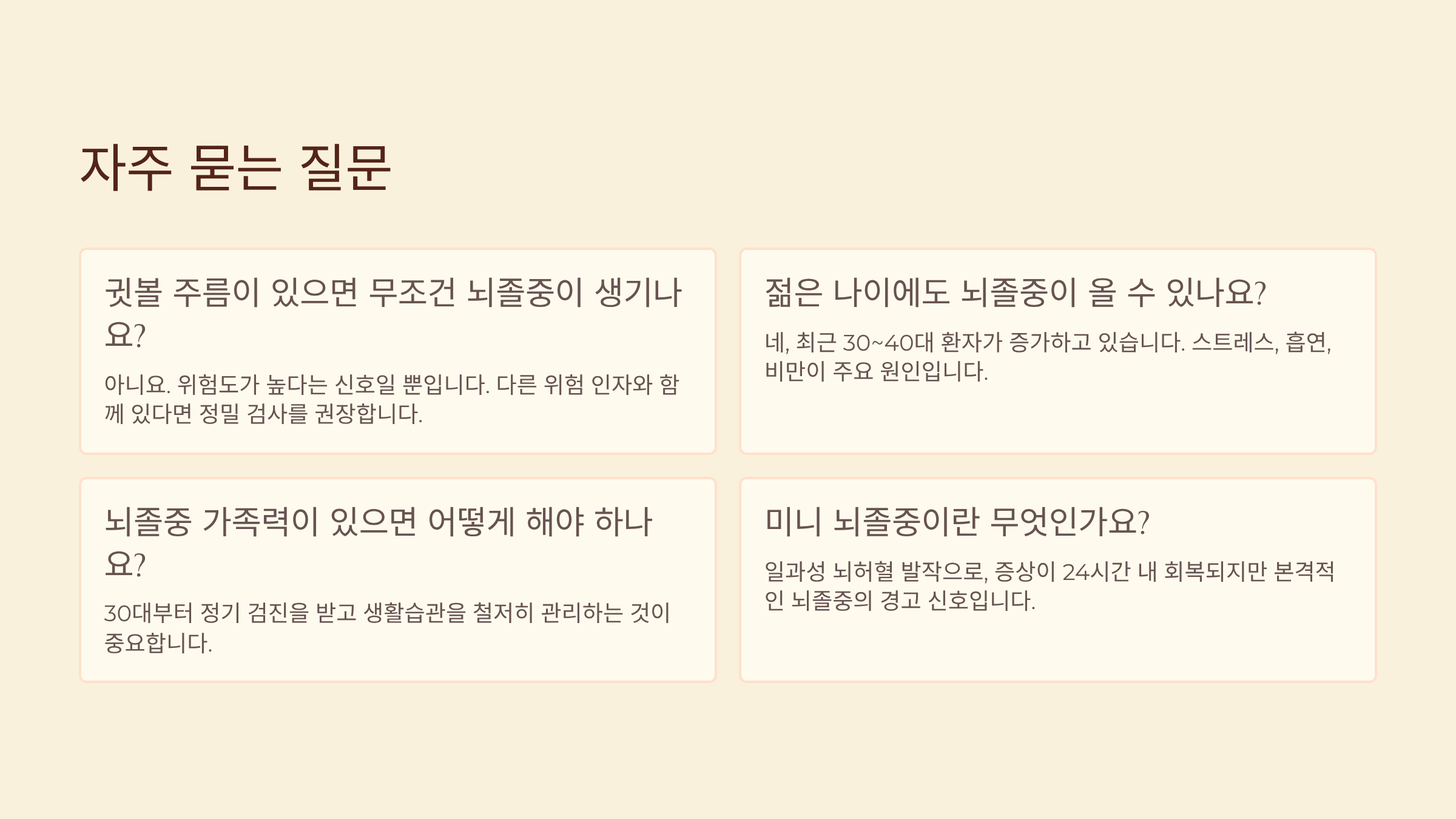 귓볼 주름을 발견했다면 이것도 하나의 신호로 받아들이고 검진을 받아보는 게 좋아요. 혈관 나이 측정이나 동맥경화도 검사를 통해 전반적인 혈관 건강 상태를 파악할 수 있어요. 조기 발견과 관리가 뇌졸중 예방의 핵심이라는 걸 잊지 마세요.
