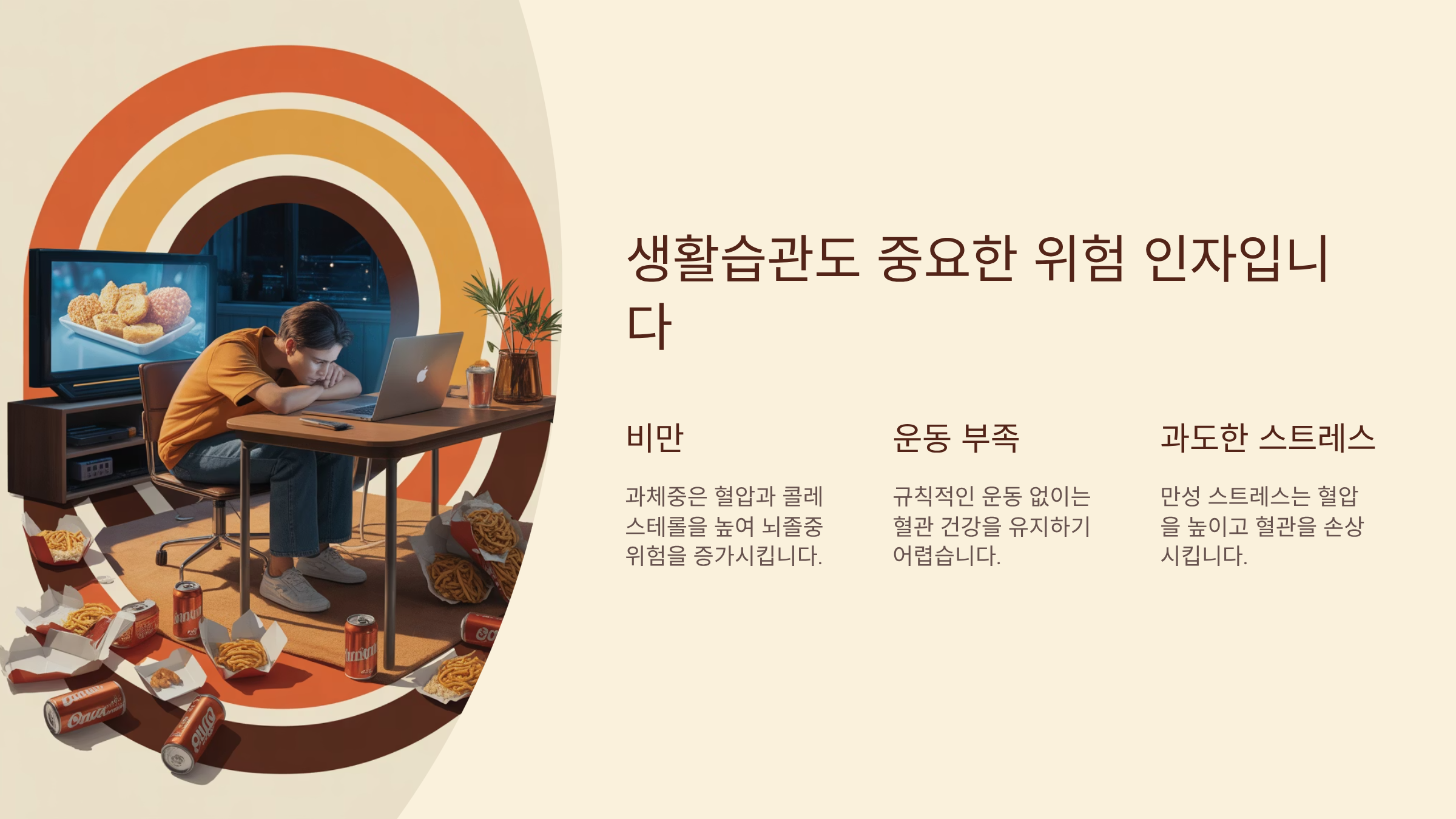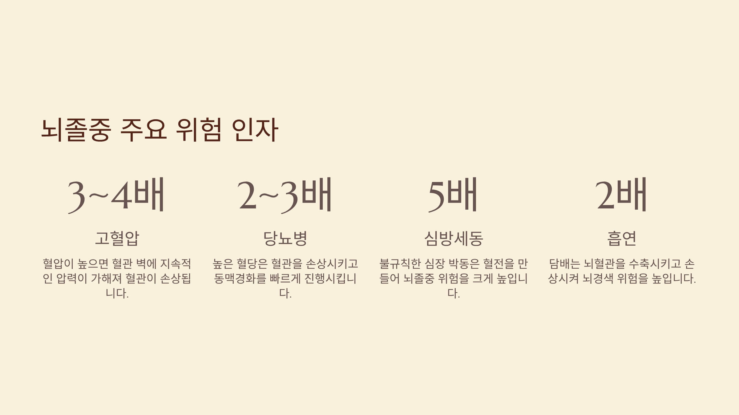 뇌졸중은 뇌혈관이 막히는 뇌경색과 터지는 뇌출혈로 나뉘는데요, 둘 다 오랜 기간 축적된 혈관 손상의 결과예요. 가장 중요한 위험 인자는 바로 고혈압이에요. 혈압이 높으면 혈관 벽에 지속적인 압력이 가해지면서 혈관이 손상되고, 결국 뇌졸중으로 이어질 수 있어요.